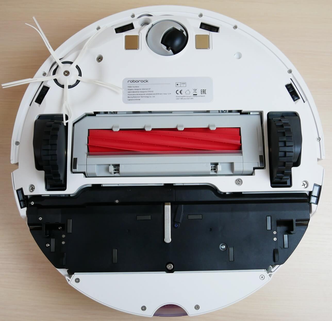 Dabar pažvelkime į „Roborock S7“ apačią. Jame yra šeši apsaugos nuo kritimo jutikliai. Priekyje yra kilimo aptikimo jutiklis. Yra vienas šoninis šepetys. Tai atnaujinto dizaino – silikoninis, penkių smaigalių. Centre matome naują turbo šepetį. Ašmenys yra gana lankstūs ir gerai pagaminti. Šepetį galima nuimti iš abiejų pusių, kad būtų pašalinti plaukai ir naminių gyvūnėlių plaukai.