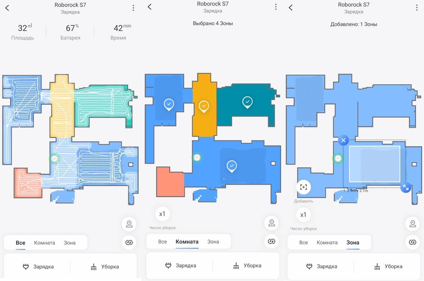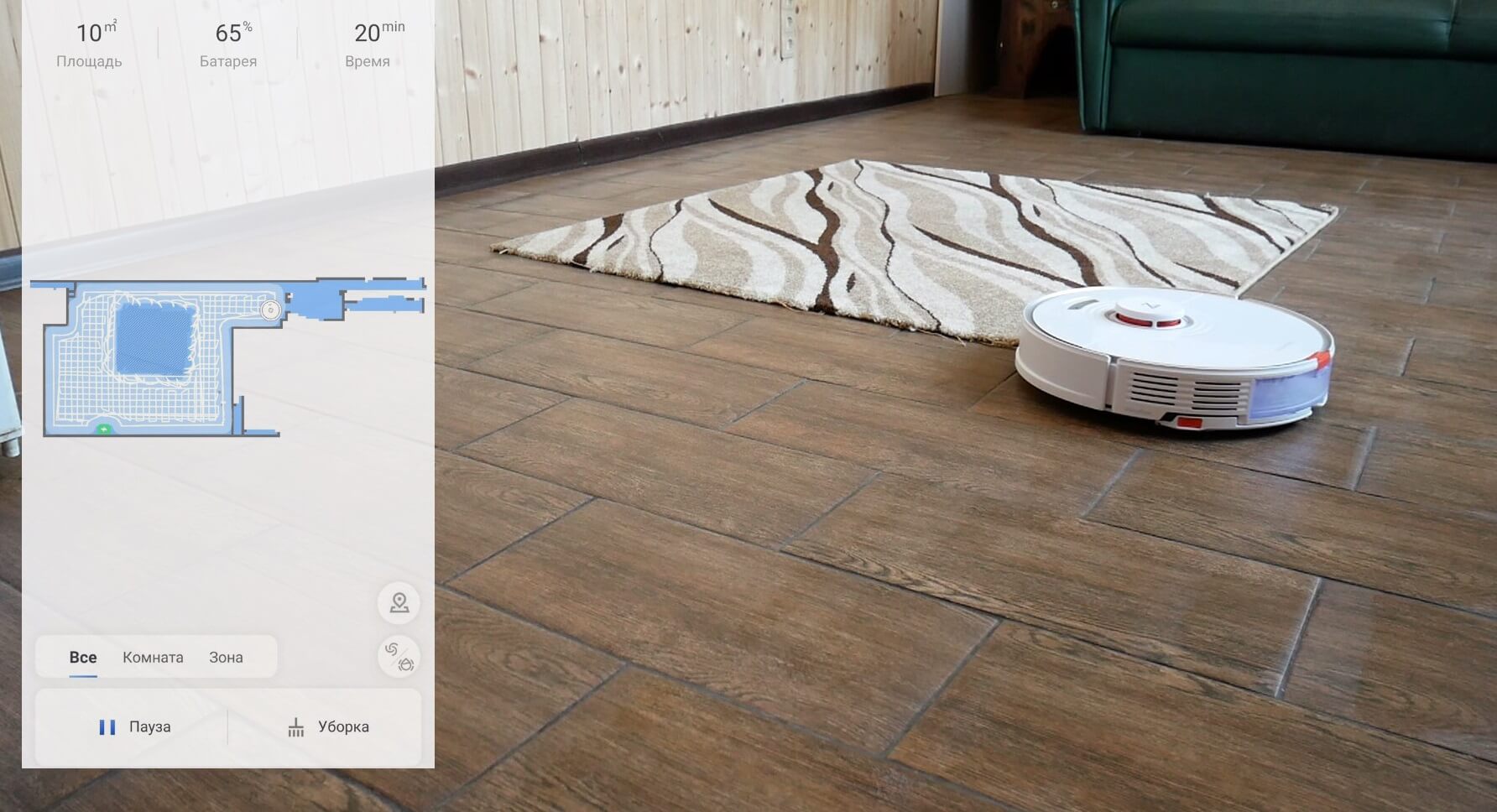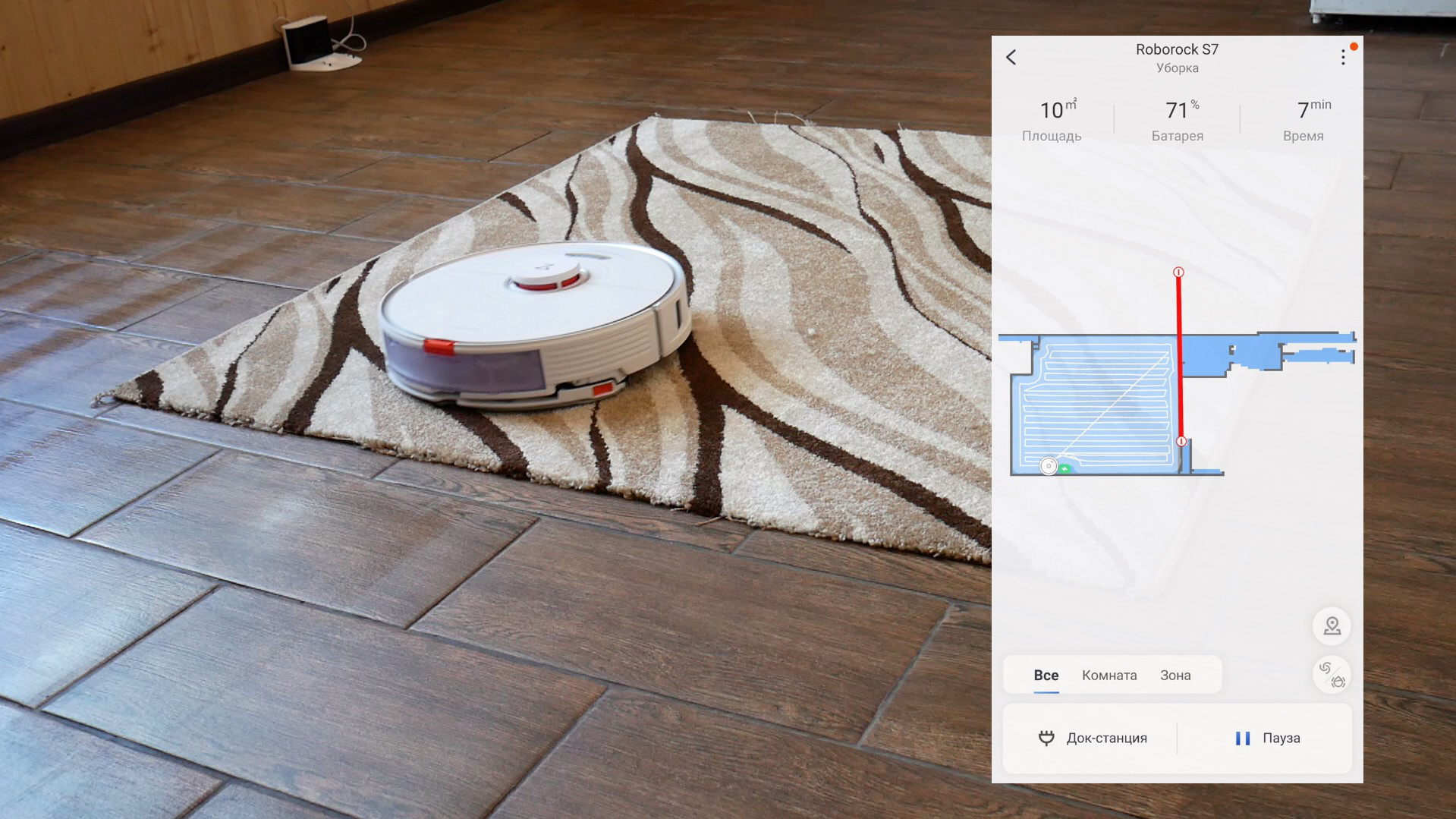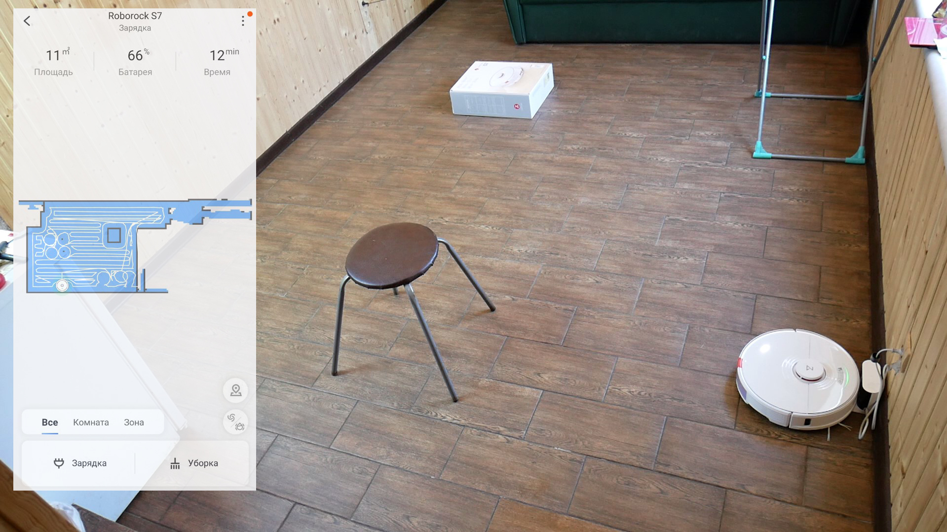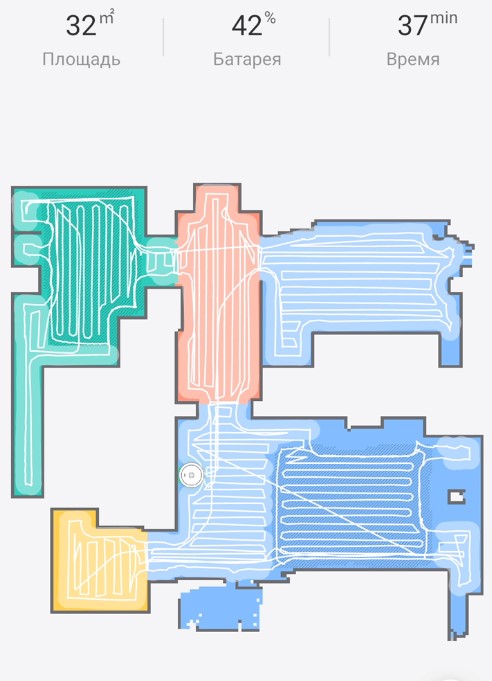 Viso namo navigacijai buvo pasirinktas režimas „Auto Carpet“, nes svetainėje ir miegamajame yra vidutinio plauko kilimai. Jie, taip sakant, purūs. „Roborock S7“ valo kambarį po kambario, pirmiausia palei perimetrą, o tada zigzago būdu. Aptikęs kilimą, jis pirmiausia jį valo pakelta platforma. Tai šiek tiek sulėtina valymo greitį, tačiau nereikia du kartus paleisti roboto šlapiam valymui ir atskiro sauso kilimų valymo. Galiausiai robotas išsiurbė 32 kvadratinius metrus naudingo ploto per 37 minutes, o panašūs robotai – 25–30 minučių.