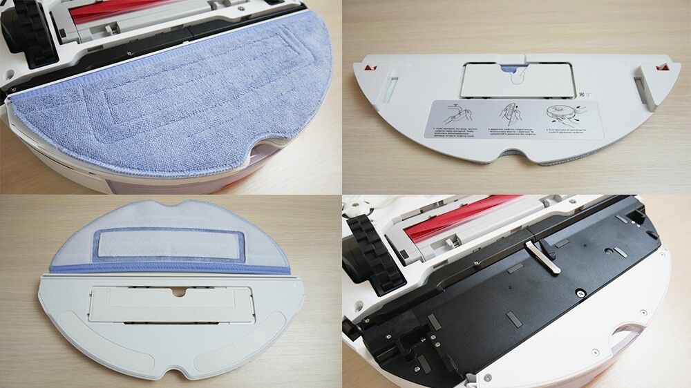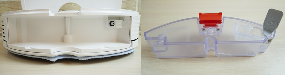 Jį galima nuimti paspaudus mygtuką. Jo išvaizda taip pat šiek tiek pasikeitė. Matome, kad viduje nėra siurblio; jis sumontuotas pačiame robote, o bakas turi tik vamzdelį.