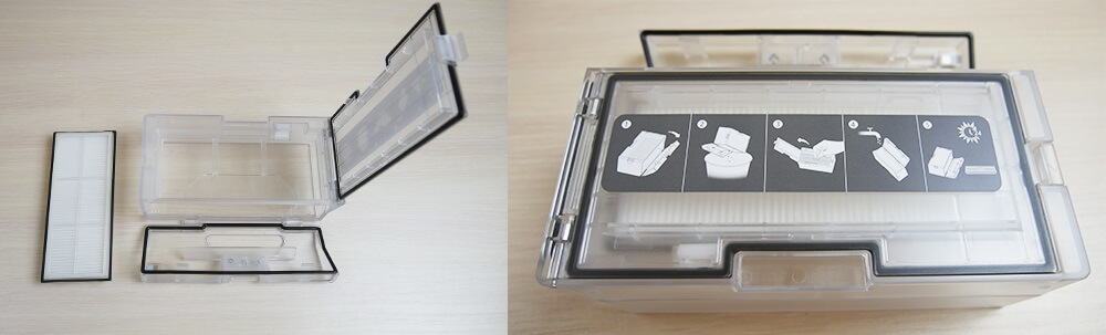 Ir štai svarbus dalykas: pats dulkių surinktuvas turi tvirtą šoninę sienelę, kuri turėtų derėti prie roboto įleidimo angos, paslėptos už dangčio. Pirkdami savaiminio valymo stotelę, greičiausiai turėsite įsigyti specialų dulkių surinktuvą arba jis jau gali būti komplekte, kas labai mažai tikėtina. Netrukus sužinosime. Dulkių surinktuvo talpa yra iki 470 ml.