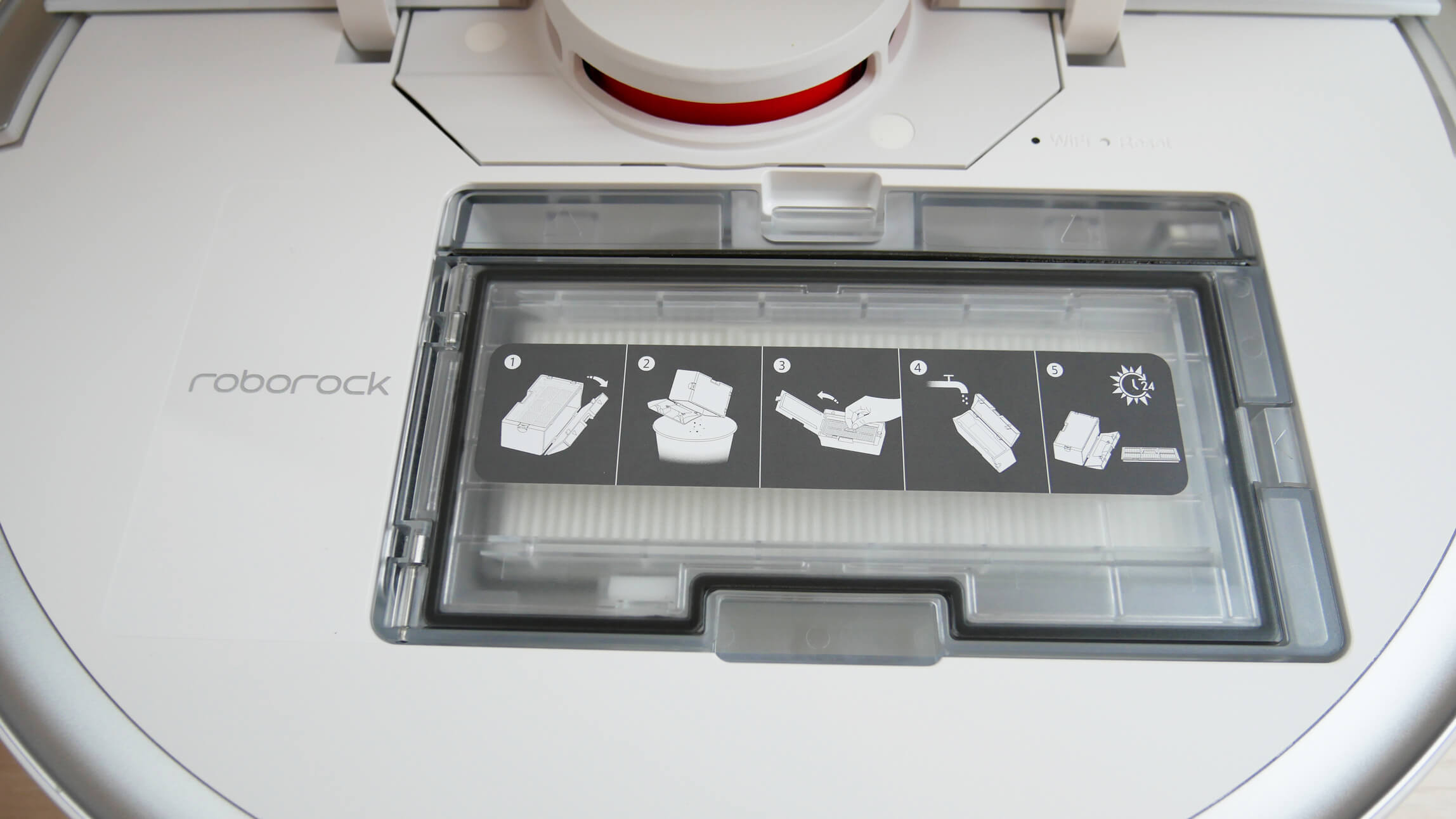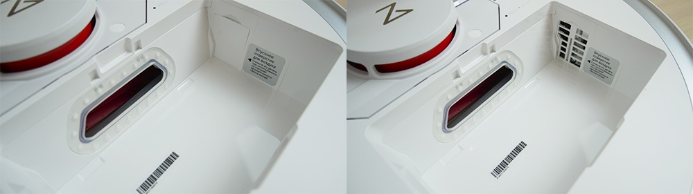Grįžkime prie dulkių surinktuvo. Teigiama, kad surinktuvą ir filtrą galima plauti vandeniu, tačiau prieš montuojant juos į robotą, svarbu kruopščiai išdžiovinti visas dalis. Apsauginio skydelio nėra. Išvalyto oro išleidimo anga yra šone, tiesiai po viršumi. HEPA filtras taip pat buvo perkeltas. Dabar jis yra viršuje. Toks išdėstymas turi vieną svarbų privalumą: roboto dulkių siurblio siurbimo galia nesumažės, kai surinktuvas prisipildys purvo. Filtravimo sistema pagrįsta tik HEPA filtru, o tai nėra idealu. Bent jau priešais filtrą galėjo būti pridėtas tinklelis.