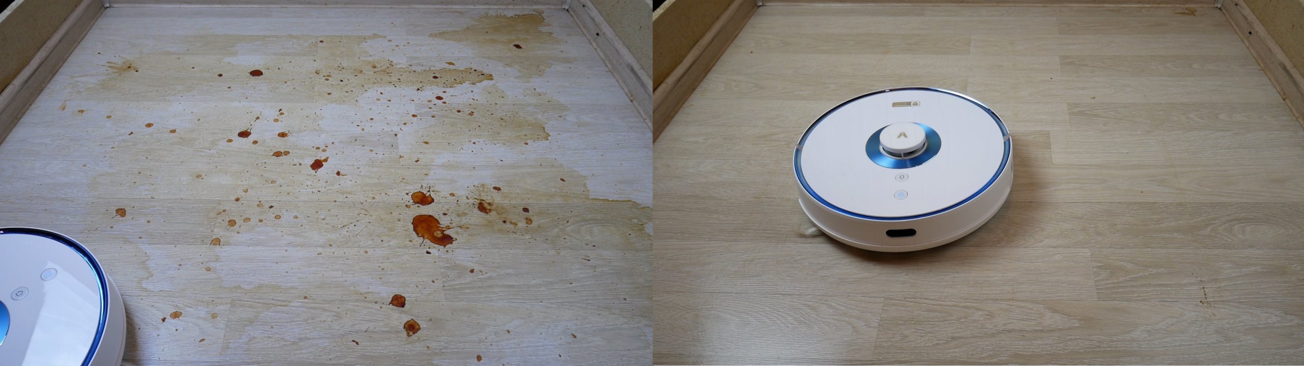 Antra, net jei periodiškai rankiniu būdu valote ratukus ir pasukamąjį volelį, kad robotas galėtų tęsti valymą, pati vibruojanti platforma neduoda laukiamų rezultatų. Robotui prireikė 20 minučių praėjimų, kad pašalintų dėmes. Tuo tarpu grindų valymo robotai užduotį atlieka vos po dviejų ar trijų praėjimų. Tai ir minėjau produkto apžvalgoje – judanti dalis yra gana maža, o vibracijos amplitudė nepalyginama su grindų valymo robotais, todėl naudoti šį robotinį dulkių siurblį tokiems tikslams yra beprasmiška.