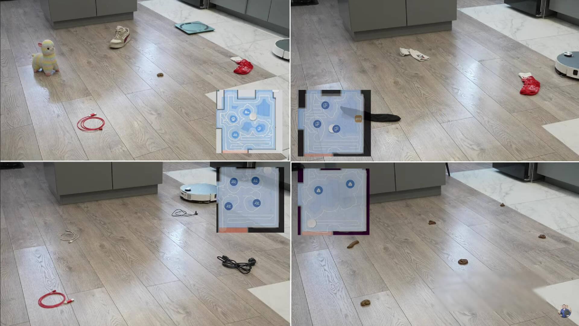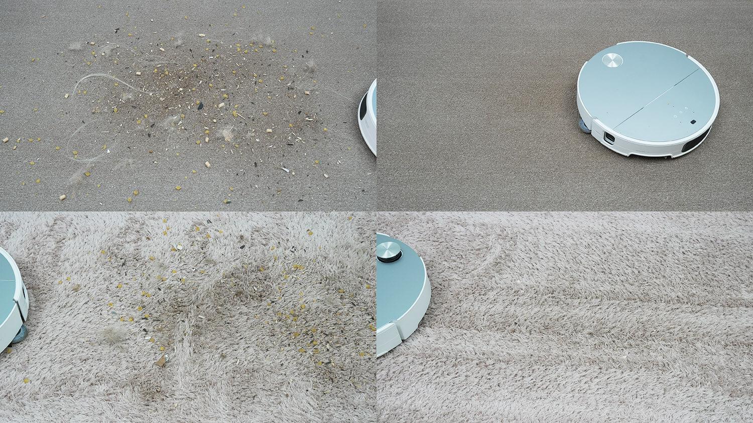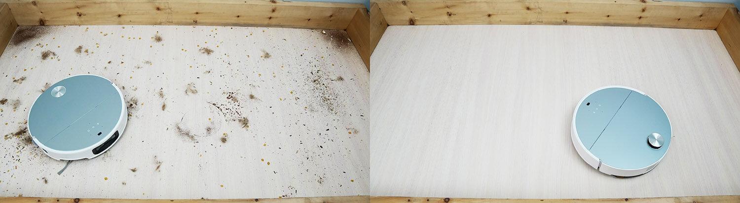 Laminuotų grindų šiukšlių surinkimo kokybė buvo gera. Nuo lentynos buvo surinktos įvairios šiukšlės, įskaitant kačių kraiko granules, kurios dažnai užkemša turbo šepetį. Svarbu tai, kad šis robotas dulkių siurblys gerai išvalė kampus, nepalikdamas jokių šiukšlių. Šoninio šepečio algoritmas pagaliau buvo patobulintas, todėl dabar nėra jokių aklųjų zonų. Tai gerai!