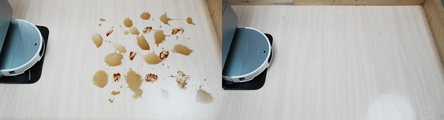Balų ir dėmių aptikimo funkcija nusipelno ypatingo dėmesio. Testavimui palikau kečupo dėmę išdžiūti per naktį ir prieš įjungdamas robotą išpyliau skaidraus skysčio ir pieno. Pirmiausia robotas aptiko pieną, tada išjungė siurbimą, pirmiausia kaip įprasta išvalydamas balos vietą, o tada vėl iššluostė tą pačią vietą gyvatės būdu, laikydamas galinę dalį prispaustą prie grindų ištiesdamas priekinį pasukamąjį volelį. Po to robotas grįžo į savo stotelę, išskalavo valymo šluostę ir tęsė valymą. Jutikliai neaptiko skaidrios balos, todėl robotas perėjo per ją kaip įprasta. Tačiau robotas aptiko dėmę ir taip pat pradėjo atskirai šluostyti grindis toje vietoje, antru kartus stipriau spausdamas valymo šluostę. Tada robotas grįžo į savo stotelę, išskalavo valymo šluostę ir tęsė valymą, šį kartą atskirai nešluostydamas dėmės, nors anksčiau jos nebuvo pašalinęs.