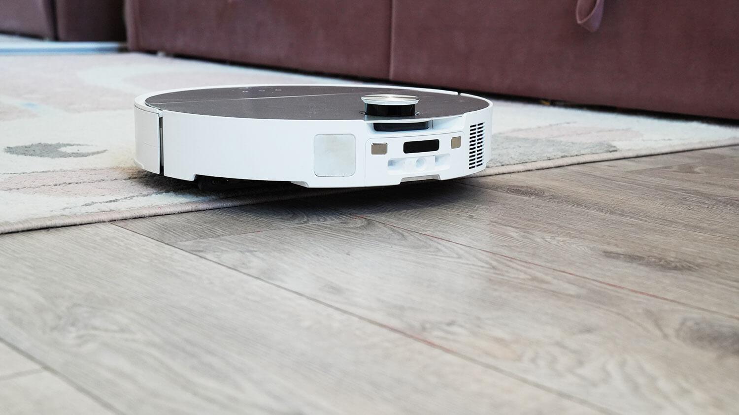 Valant kilimus yra keletas niuansų. „Roborock S9 MaxV Ultra“ gerai valo trumpo plauko kilimus, tačiau šoninis šepetys pakyla ir sustoja suktis, kaip ir anksčiau išleistame „Roborock Saros 10R“. Šios funkcijos negalima išjungti. Dėl to, jei kilimas padėtas arti sienos, sritis prie grindjuosčių nėra iššluojama ir visos šiukšlės lieka ten.