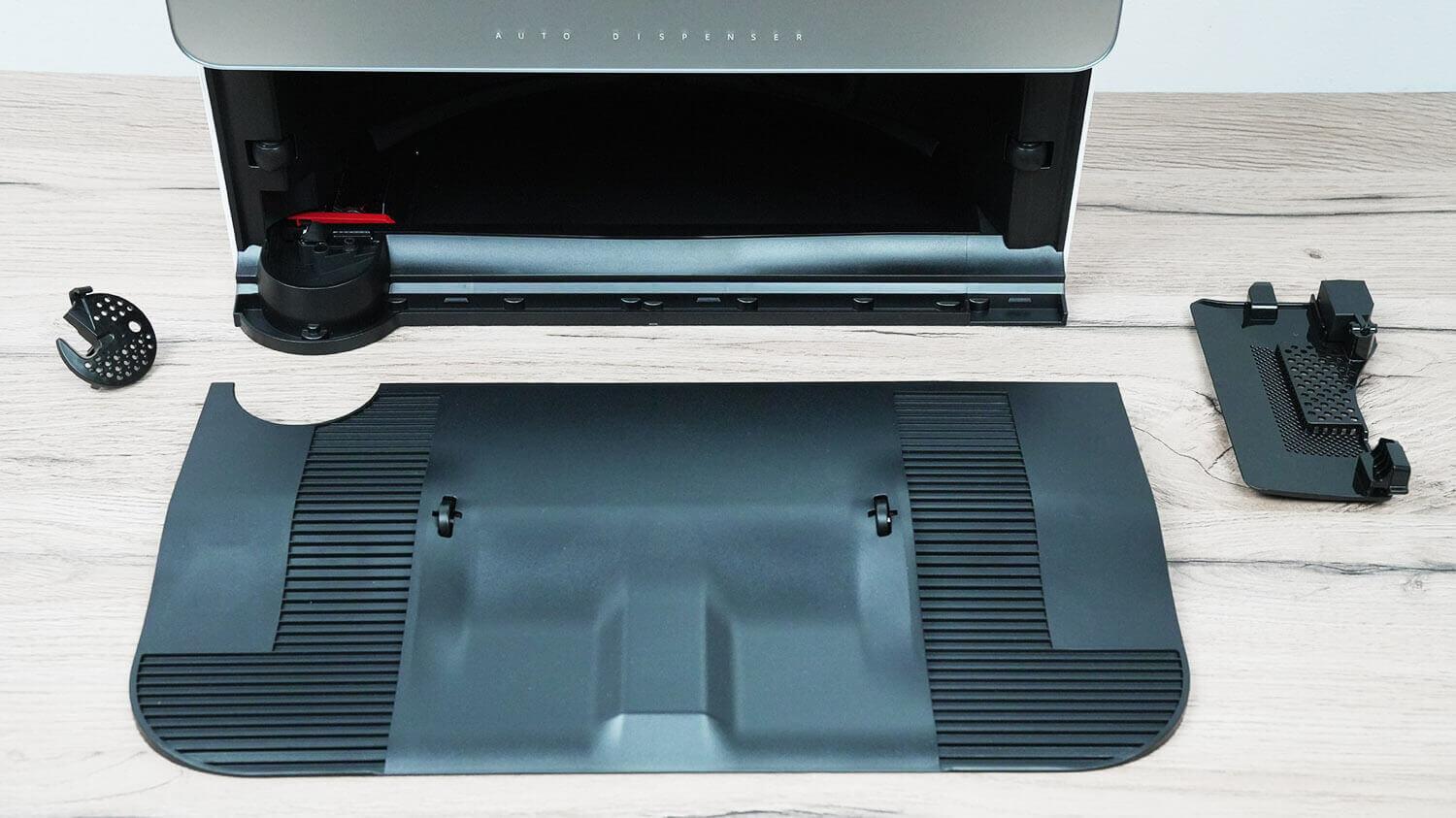 Roboto prieigos rampa yra nuimama. Pagrindinė stoties valymo šluostė valoma specialiu voleliu su elastingais šereliais. Išleidimo zonoje yra nuimamas šiurkštus vandens filtras. Pagrindo dugnas yra savaime išsivalantis grandiklių pagalba, o tai labai patogu. Papildoma apvali valymo šluostė valoma atskiroje vietoje.