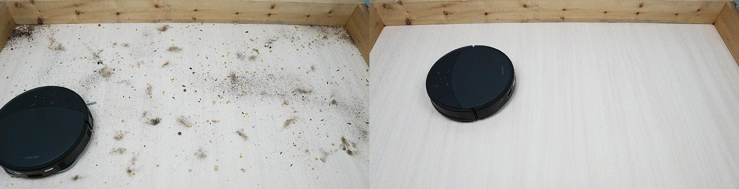Roboto gebėjimas surinkti įvairių tipų šiukšles nuo laminuotų grindų yra geras, tačiau yra vienas trūkumas. Matote, kad pirmojo praėjimo metu robotas praleido vieną kampą. Antrojo praėjimo metu jis išvalė plotą geriau. Trečiojo praėjimo metu jis visiškai išvalė visas grindis, pasiekdamas puikų sauso valymo našumą. Pastebėjau, kad ištraukiamas šoninis šepetys ne visada veikia tinkamai. Kartais jis nevisiškai sušluoja šiukšles ir dingsta korpuse. Išbandžiau jį ir su įjungta aptikimo sistema, ir be jos, ir netgi pakoregavau jutiklinio ekrano jautrumą. Tačiau kai algoritmas veikia teisingai, šoninis šepetys puikiai atlieka kampų šlavimo darbą. Manau, kad ši problema bus išspręsta būsimuose programinės įrangos atnaujinimuose.
