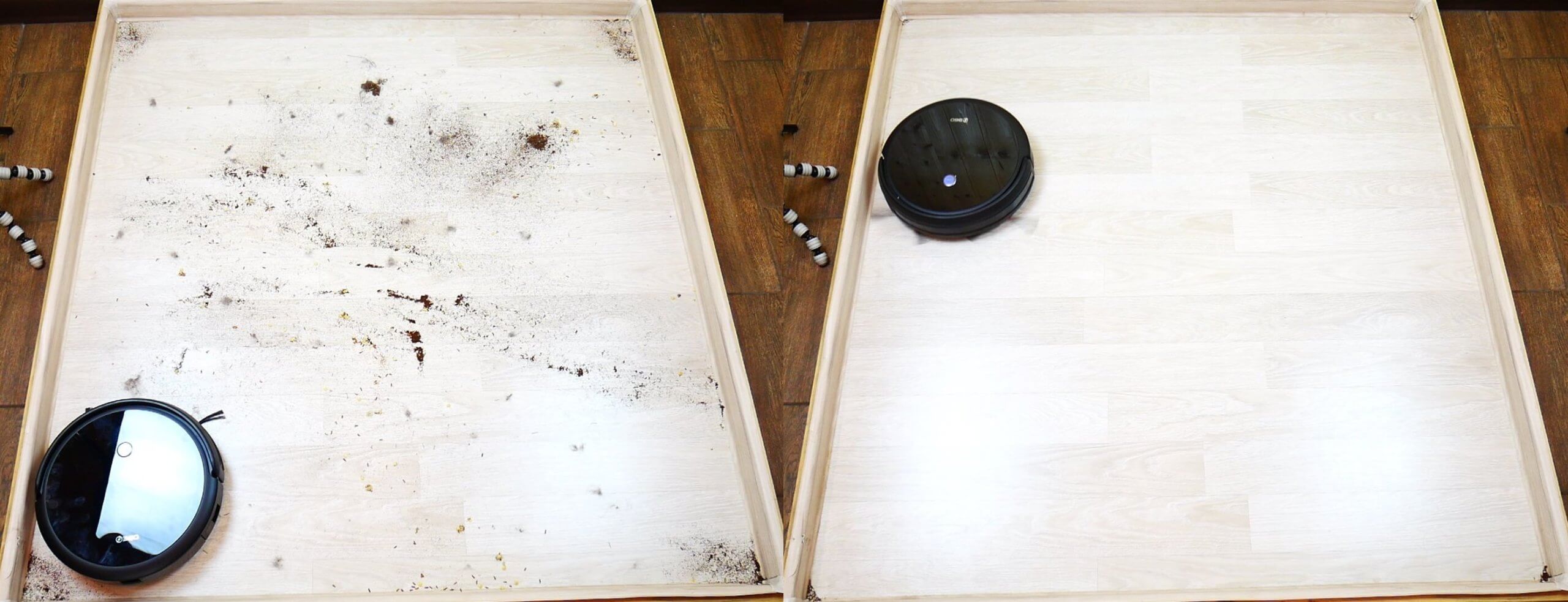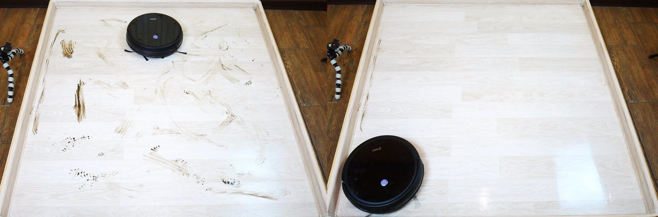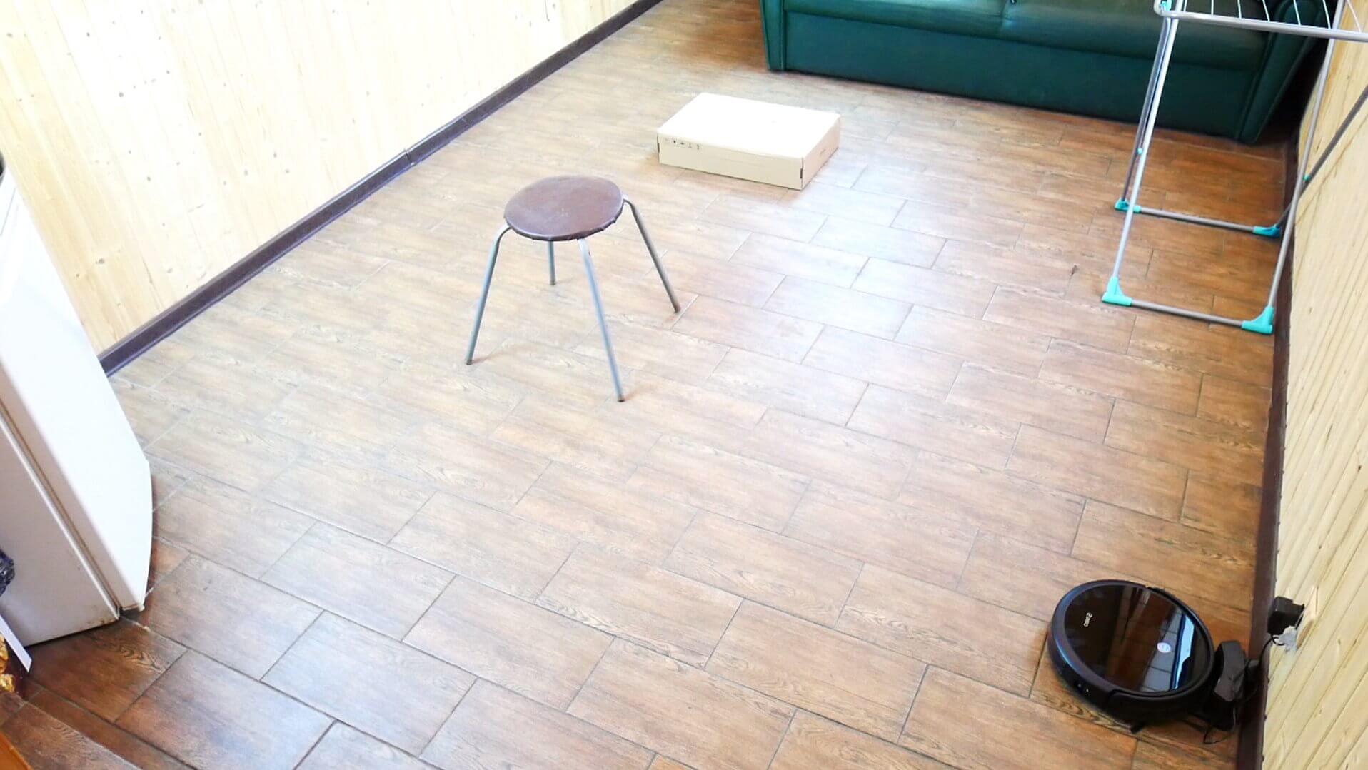 Patikrinkime laminuotų grindų valymo kokybę. Robotas pašalino visus pridžiūvusius nešvarumus nuo pagrindinės stovo dalies, palikdamas tik dalį grindjuostės, kurios šluostė nepasiekė. Kol kas tai vienintelė kritika visoje apžvalgoje.