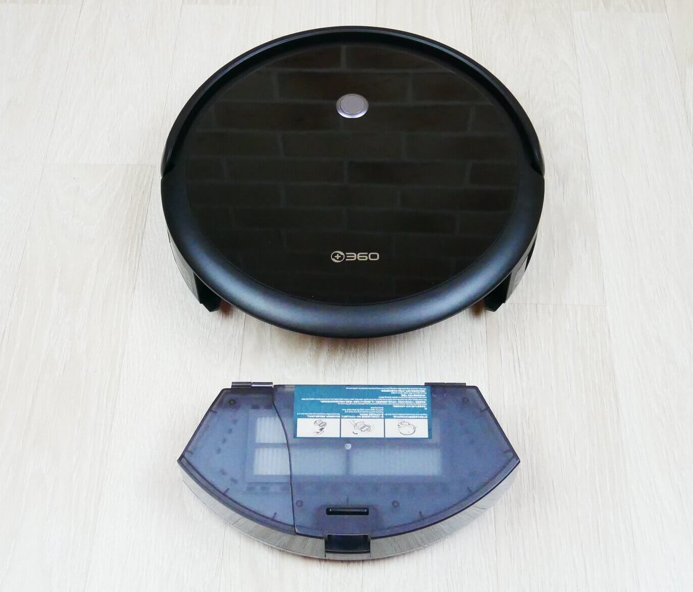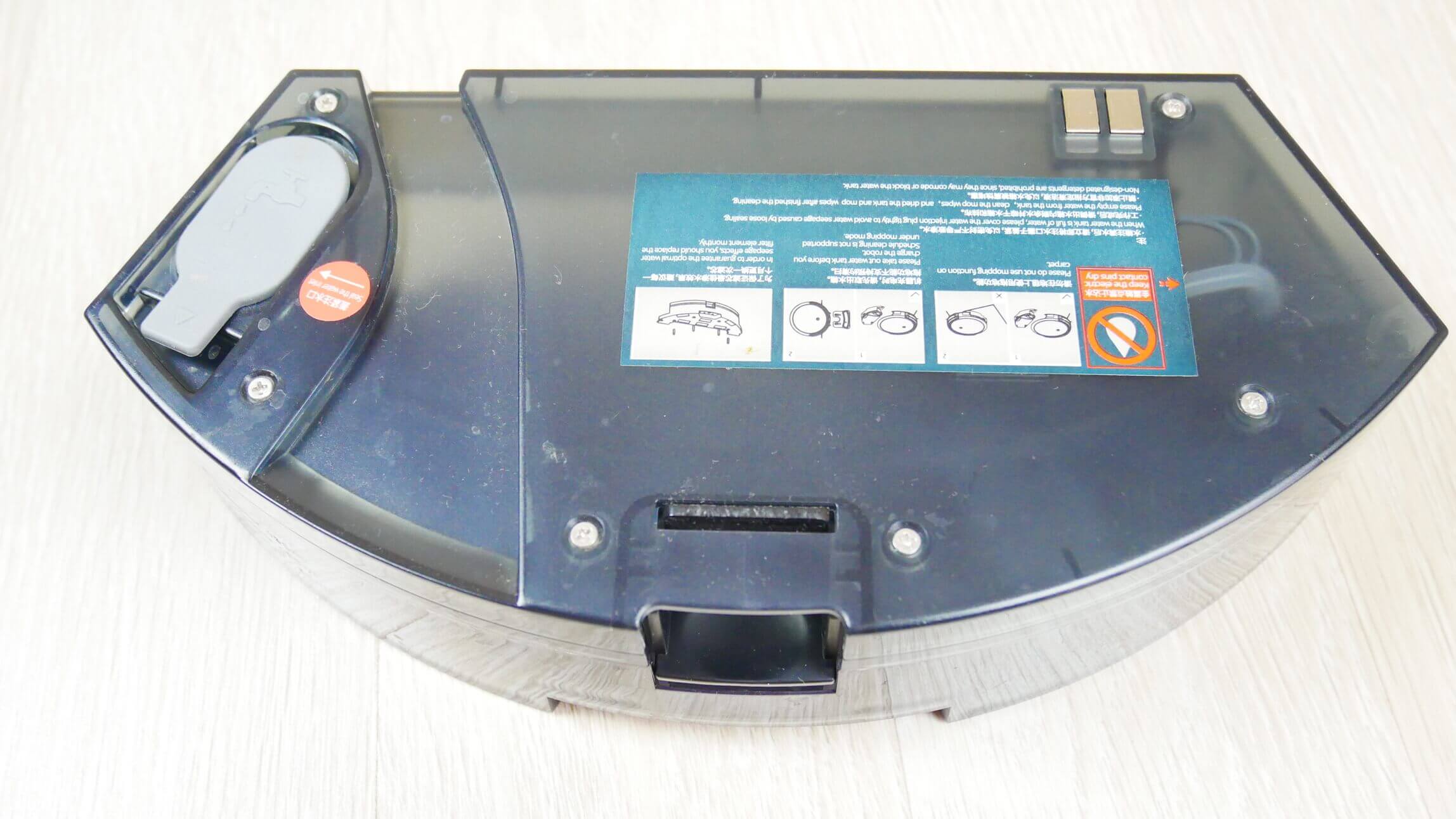 Vandens bake yra papildomas skyrius sausoms atliekoms. Šlapio valymo režimu robotas gali sušluoti šiukšles, bet ne siurbti, todėl prašome tai turėti omenyje. Gamintojo teigimu, bake telpa 300 ml vandens, nors ant paties bako nurodoma 150 ml ir viena padala didesnė talpa. Šluostė tvirtinama lipnia juosta, o vanduo išleidžiamas per keturias skylutes su dozatoriais.