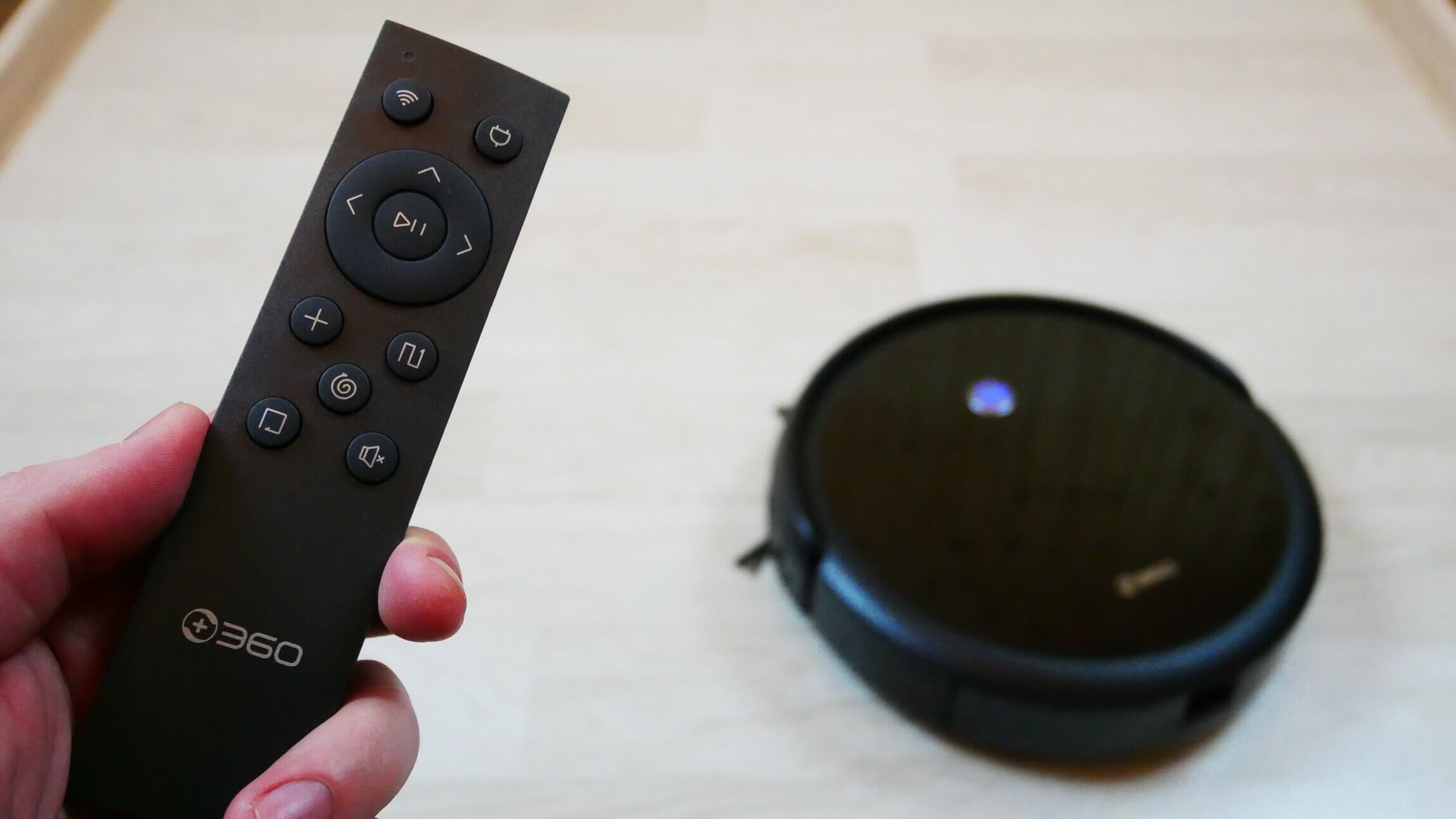 Pažvelkime į nuotolinio valdymo pulto funkcijas. Viršutinis kairysis mygtukas prijungia robotą prie „Wi-Fi“ tinklo, o šalia jo yra priverstinio grįžimo į bazę mygtukas. Apačioje yra vairasvirtė roboto dulkių siurblio rankiniam valdymui ir centre esantis paleidimo / pauzės mygtukas.