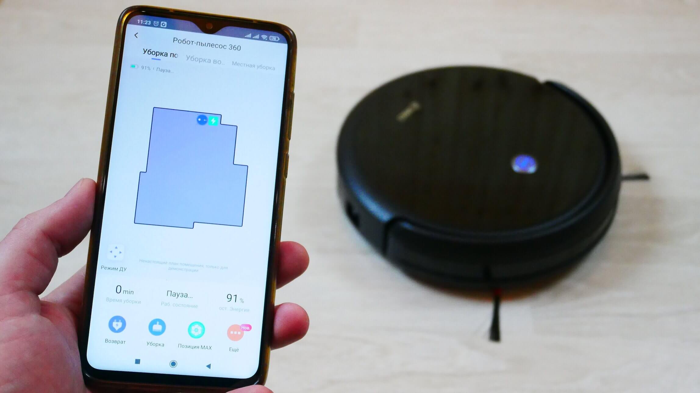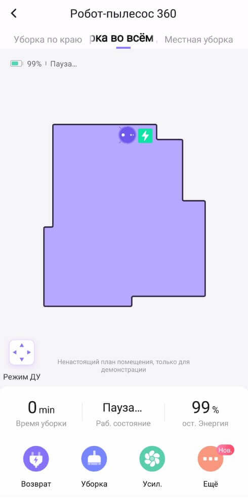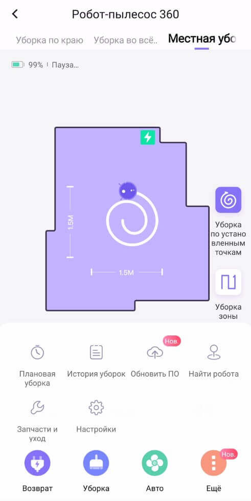 Pagrindiniame valdymo skydelyje viršuje galite pasirinkti vieną iš trijų valymo režimų: perimetro, automatinį ir taškinį. Taškinio valymo režimu galite pasirinkti konkrečią valymo vietą, kur robotas judės, taip pat praėjimų skaičių. Rankiniam valdymui taip pat yra nuotolinio valdymo pultas.
