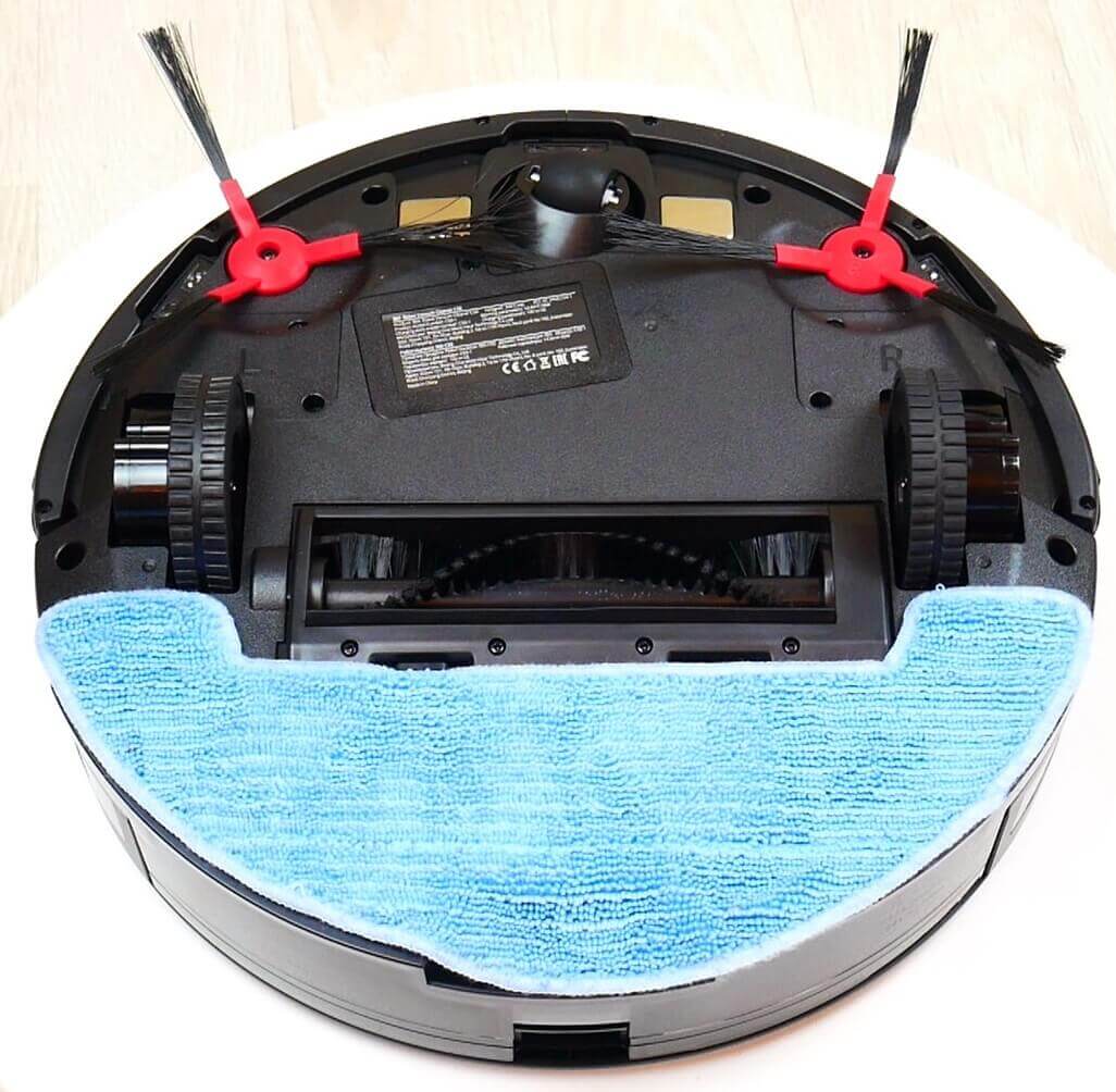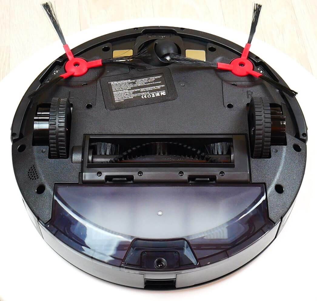 Pažvelkime į roboto apačią. Jame yra du šoniniai šepečiai, kiekvienas su trijų šerelių konstrukcija. Jie pritvirtinti varžtais. Priekyje yra trys apsaugos nuo kritimo jutikliai. Centre yra turbo šepetys. Šereliai nėra labai tankūs, nėra silikoninių įdėklų. Šepečio mechanizmas nėra nuimamas.