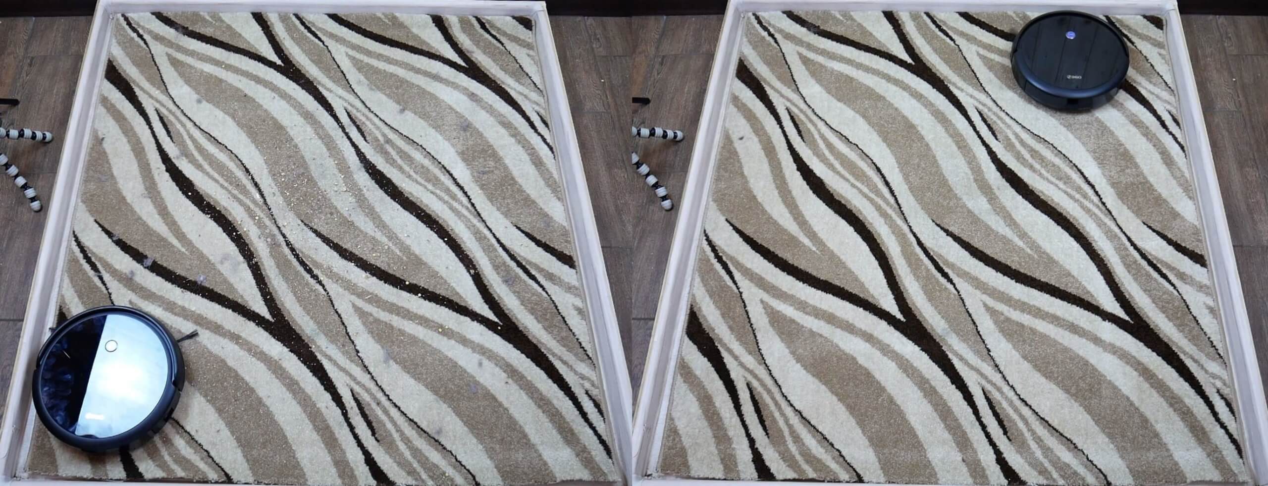 Tos pačios šiukšlės buvo išbarstytos ant kilimo. „360 C50“ be jokių sunkumų susidorojo su užduotimi, kruopščiai išvalydamas kilimą. Liko tik vienas plaukų kuokštas, tačiau jis buvo įsivėlęs į kilimo krūvą ir turėjo būti pašalintas rankiniu būdu – užduotis, kuri viršijo roboto galimybes.