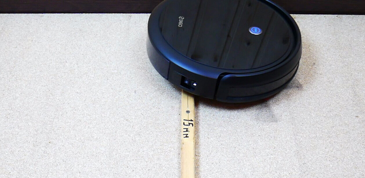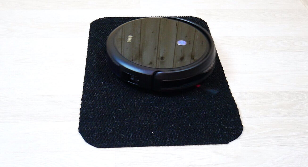 Tamsūs paviršiai problemų nekelia. Mūsų bandymo metu robotas pervažiavo juodą kilimą neatpažindamas jo kaip aukščio skirtumo.