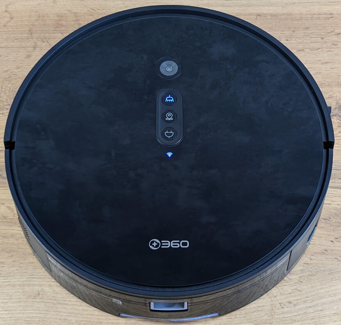 Dabar pažvelkime į robotinį dulkių siurblį „360 P7“. Jis apvalus ir juodos spalvos. Viršutinis dangtis yra blizgus ir lengvai susitepa. Korpusas yra tik 76 mm atstumu nuo grindų.