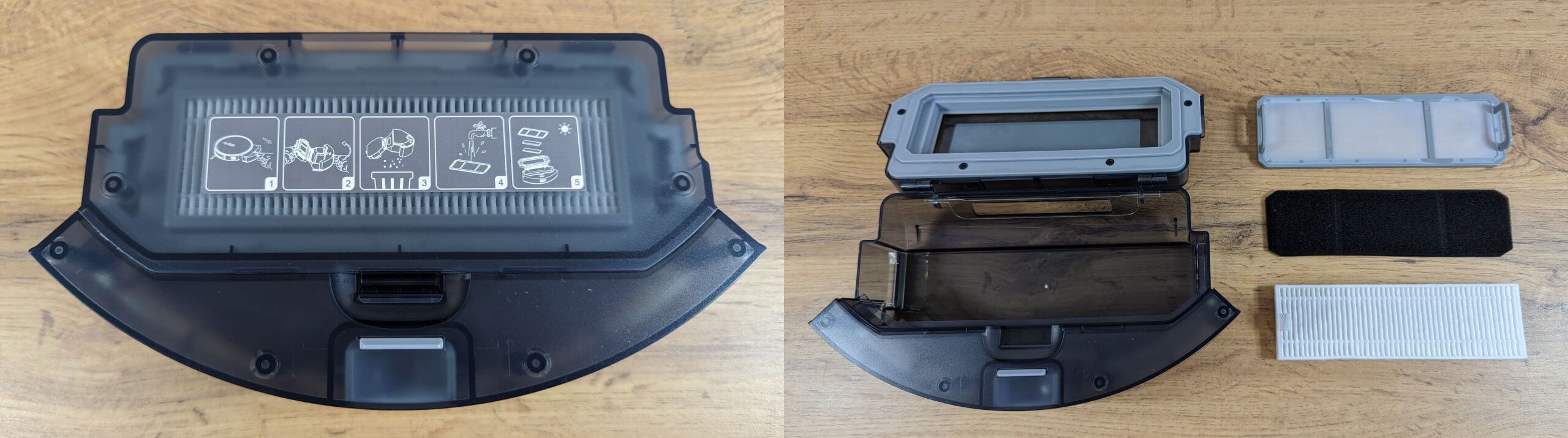 - Kombinuotas vandens ir šiukšlių konteineris su atskiru dulkių surinkėju, jau įmontuotu robote.