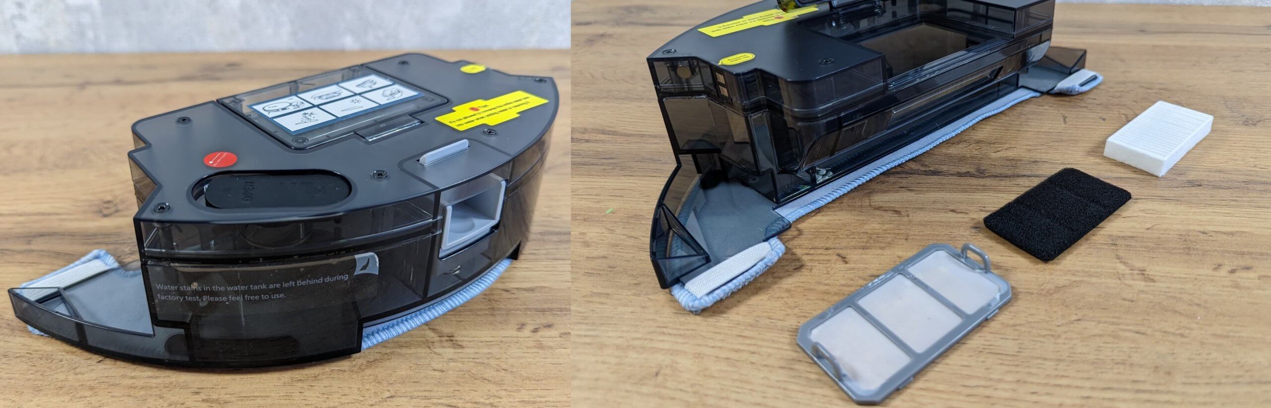 Vietoj dulkių surinktuvo robotas gali būti aprūpintas kombinuotu vandens ir purvo konteineriu. Konteineryje telpa iki 350 ml vandens, kuris specialiu siurbliu pumpuojamas į valymo šluostę. Taip pat yra nedidelis sausų atliekų skyrius, kuriame taip pat yra triguba filtravimo sistema. Svarbu atkreipti dėmesį, kad 360 P7 gali vienu metu siurbti ir šluostyti grindis. Tai privalumas!