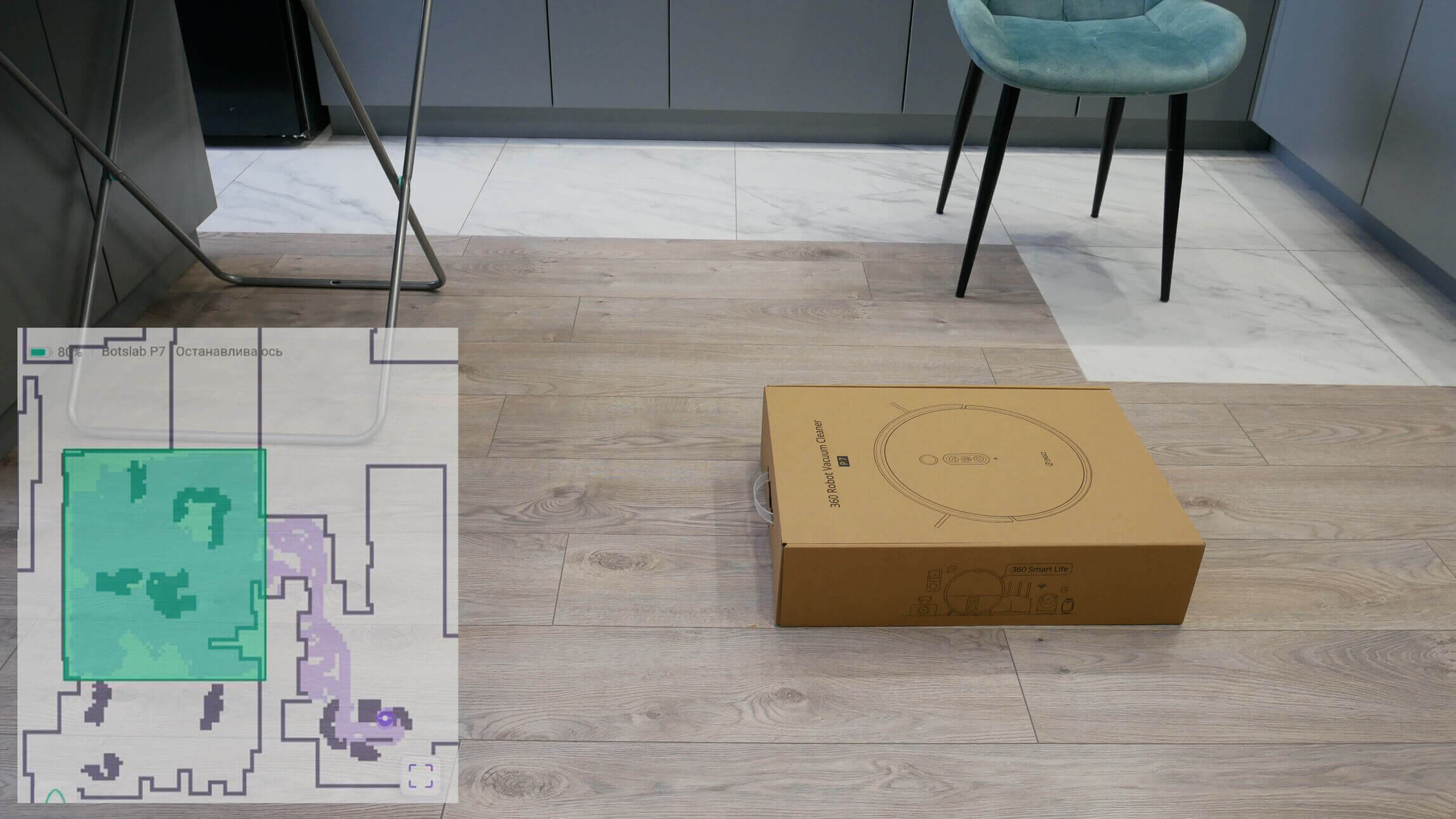 Galiausiai pereikime prie bandymų. Pirmiausia patikrinsime „360 P7“ navigaciją kambaryje su kliūtimis. Robotas dulkių siurblys pirmiausia išvalo visą prieinamą plotą vingiuotu raštu, o tada palei perimetrą. Jis specialiai nevalė aplink kėdės ir dėžės kojas, kaip įprasta daugumai kameromis paremtų robotų. Vieno iš praėjimų virš džiovyklės kojų metu robotas užstrigo ir įėjo į klaidos būseną. Atnaujinus valymą, procesas buvo nutrauktas, o robotas dulkių siurblys pradėjo valyti naują plotą, ignoruodamas jau apvalytą plotą ir nurodytą valymo zoną. Šis bandymas nepavyko.