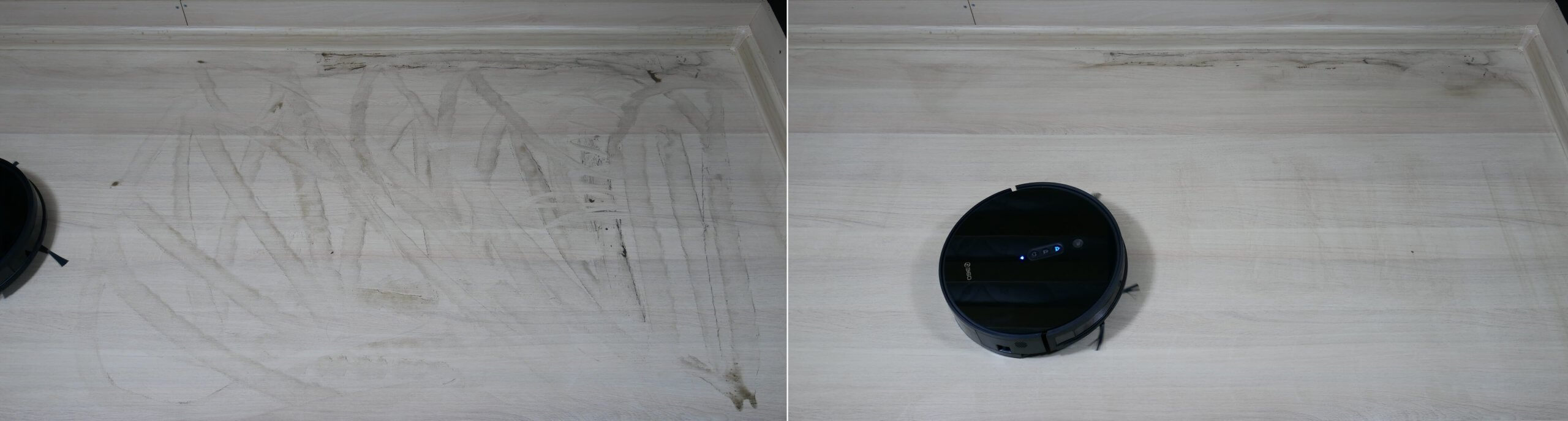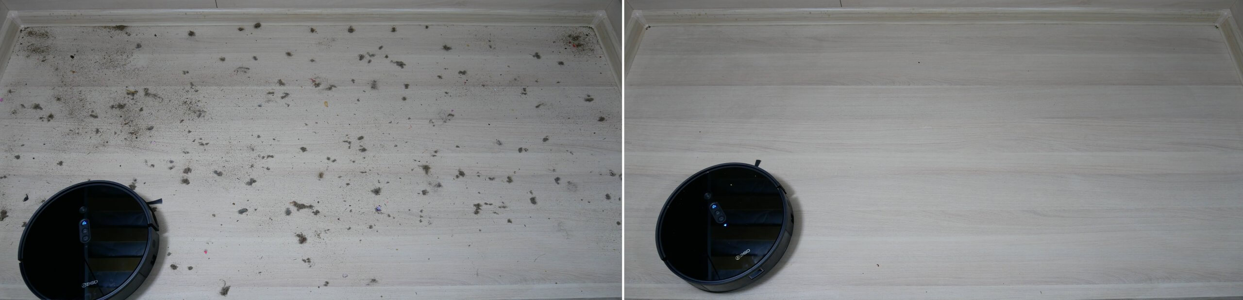 Įvairių tipų šiukšlių surinkimo našumas nuo laminuotų grindų yra geras. Robotas netgi geriau nei kiti apvalūs modeliai iššluoja šiukšles iš kampų. Tai dar vienas šio modelio privalumas! Plaukai ir naminių gyvūnėlių plaukai susipainiojo centriniame šepetyje, tačiau didžioji dalis šiukšlių vis tiek pateko į dulkių konteinerį. Testas išlaikytas!
