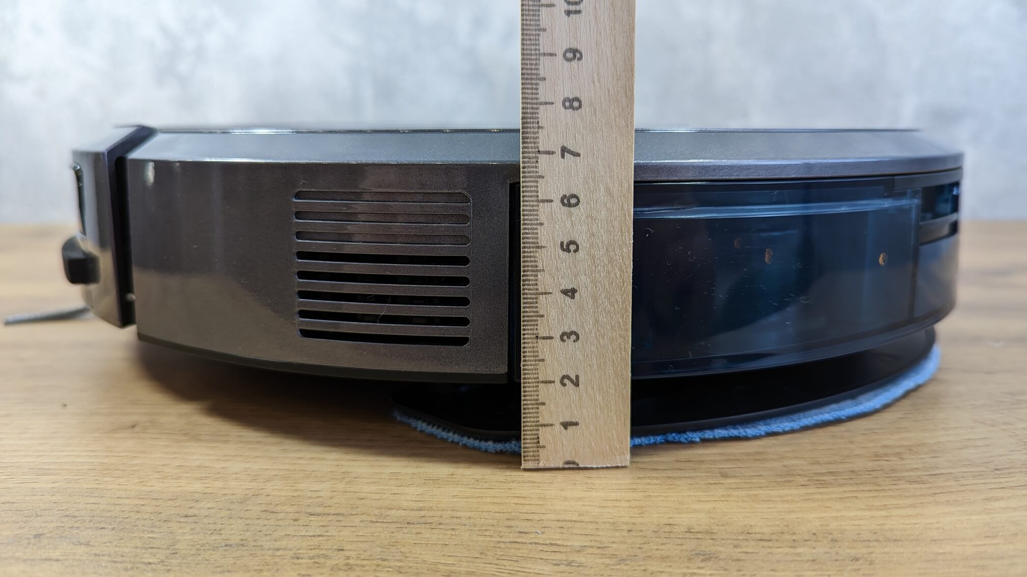 Bet kokiu atveju, robotas kruopščiai sudrėkina šluostę, palikdamas tolygų šlapią žymę ant grindų. Testas išlaikytas!