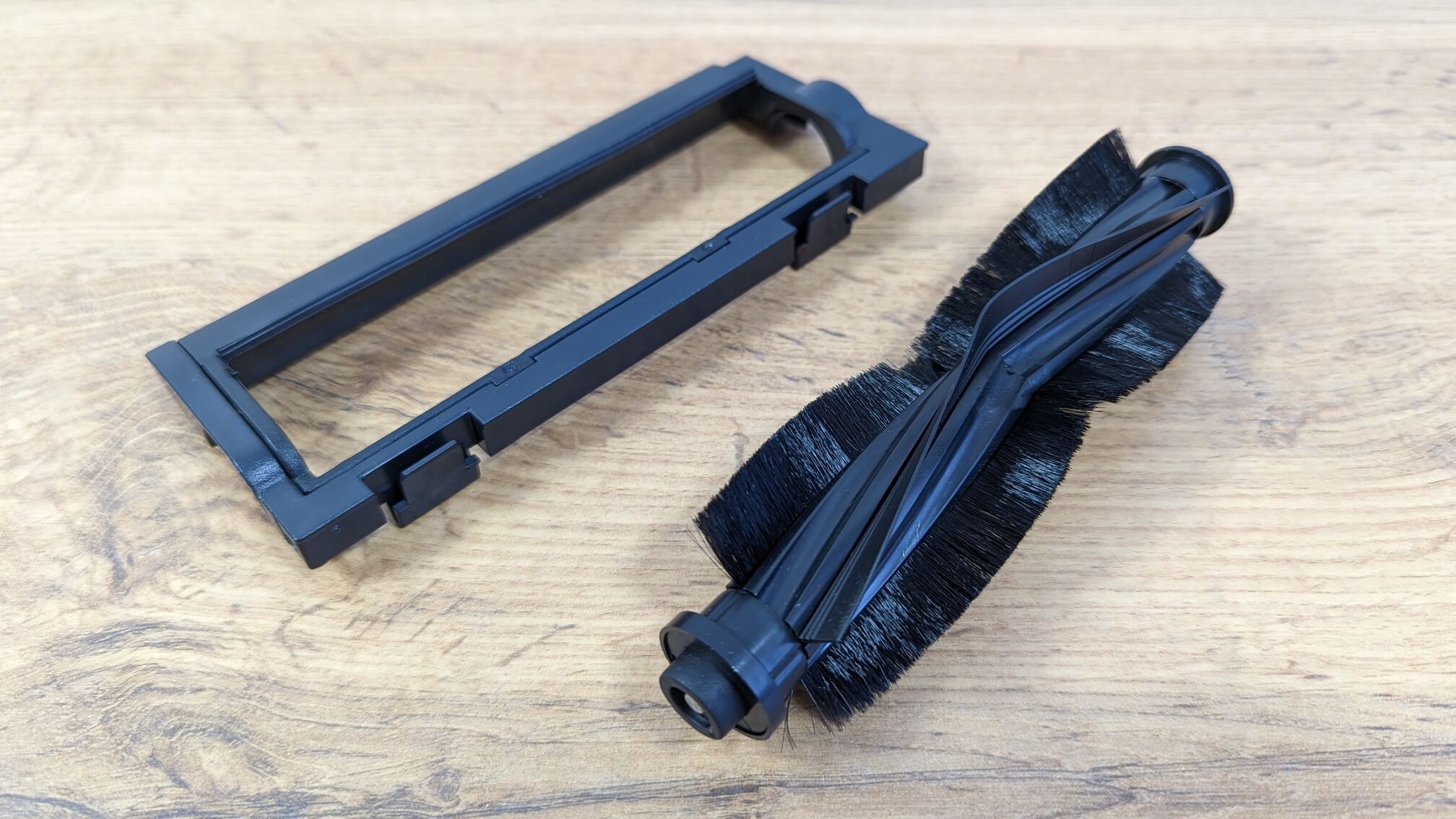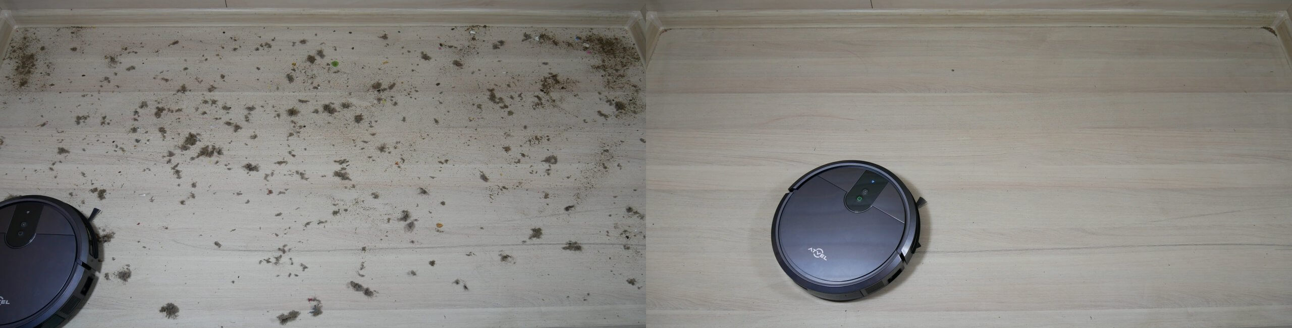 Laminuotų grindų šiukšlių surinkimo kokybė taip pat nepaliko jokių abejonių. Robotas sugebėjo surinkti įvairių tekstūrų šiukšles, palikdamas tik nedidelį kiekį kampuose, kas būdinga beveik visiems apvaliems robotams. Į centrinį šepetį įsipainiojo šiek tiek plaukų ir naminių gyvūnėlių plaukų, tačiau didžioji dalis šiukšlių vis tiek buvo surinkta dulkių konteineryje. Bandymas sėkmingas.