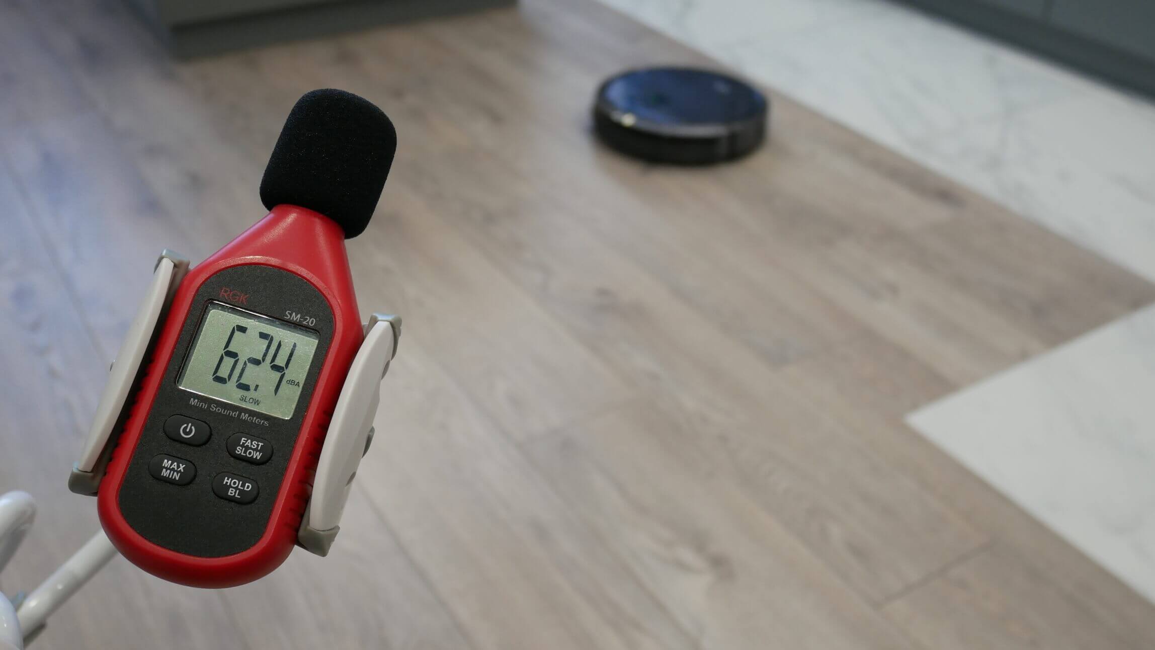 Galiausiai, išmatavome „Atvel R70“ triukšmo lygį skirtingais režimais. Standartiniu režimu triukšmo lygis svyravo nuo 62 iki 63 dB, o esant maksimaliai galiai, pikas siekė 64 dB. Atsitrenkus į baldus ir grindjuostes, buvo nedideli triukšmo šuoliai, tačiau apskritai robotas dulkių siurblys nėra pernelyg triukšmingas, o tai dar vienas privalumas.