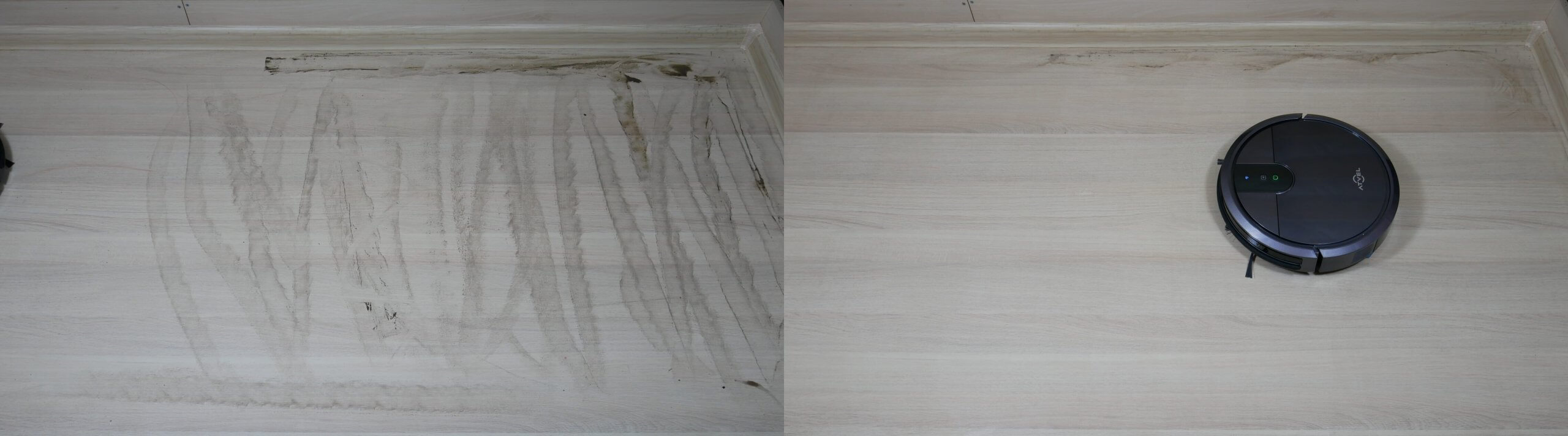 Mane sužavėjo šlapio valymo efektyvumas. „Atvel R70“ ne tik gali vienu metu siurbti ir plauti grindis, bet ir puikiai susidoroja su nedidelėmis dėmėmis. Siaura juostelė palei grindjuostę liko nenuplauta, bet, kita vertus, tai yra visų mūsų apžvelgtų robotų dulkių siurblių silpnoji vieta.