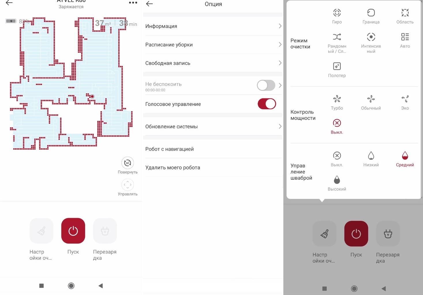 Grįžkime prie pagrindinio valdymo skydelio. Čia galite įjungti rankinį valdymą, pasirinkti vieną iš 7 veikimo režimų, reguliuoti siurbimo galią ir vandens srautą. Kalbant apie veikimo režimus, automatiniu režimu robotas valo visą plotą gyvatės principu, tada persijungia į perimetro šlavimą ir pradeda judėti atsitiktine tvarka, kol išsikrauna akumuliatorius, po to automatiškai grįžta į bazę įkrauti. Mano nuomone, geriau naudoti giroskopinį režimą, kai robotas dulkių siurblys šluoja gyvatės principu, tada aplink perimetrą ir iš karto grįžta į bazę. Valymo kokybė iš esmės nesiskiria, tačiau tai taupo laiką.