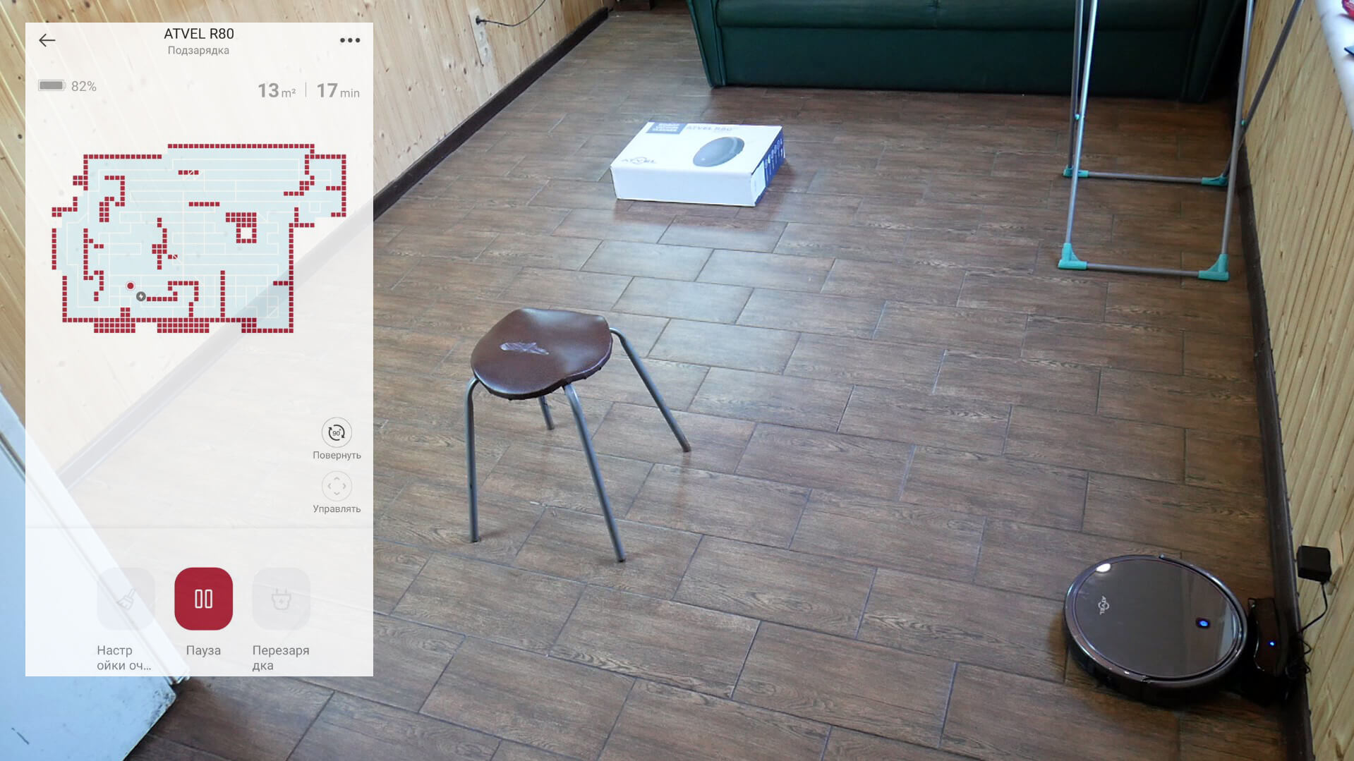 Pirmiausia išbandykime „Atvel SmartGyro R80“ navigaciją kambaryje su kliūtimis. Robotas buvo paleistas „Gyro“ režimu. Pirmiausia jis perėjo visą prieinamą plotą gyvatės formos trajektorija, tada judėjo aplink perimetrą ir automatiškai grįžo į pagrindą. Jis neužkliūva už kėdės kojų ir dėžės, bet neužkliūva ir ant džiovyklės kojų. Apskritai navigacija buvo standartinė robotų dulkių siurblių su giroskopu sistemai.