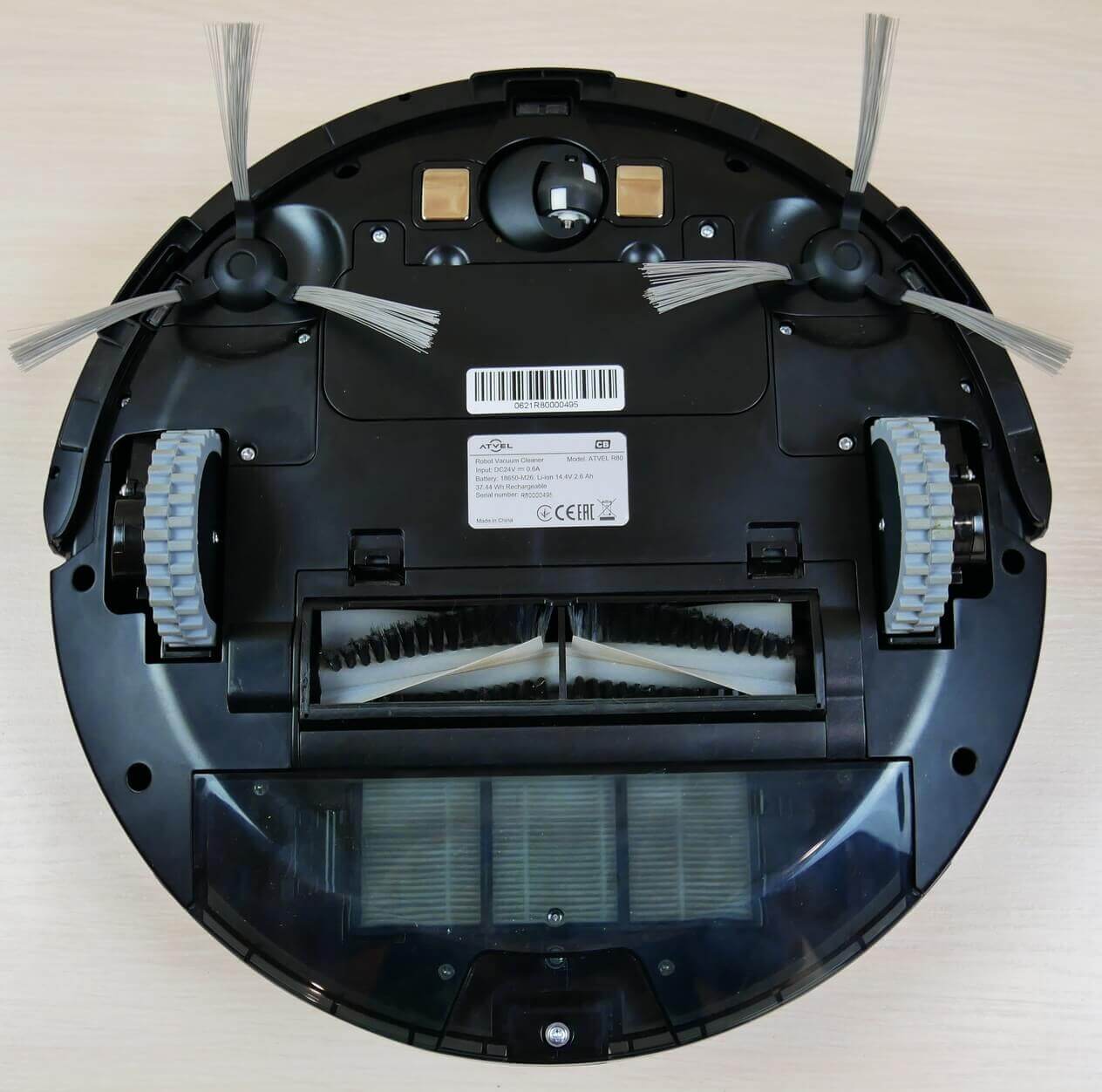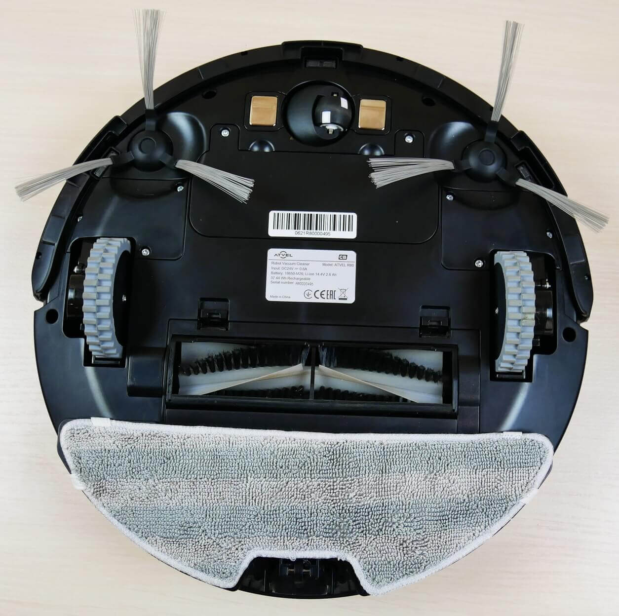 Pažvelkime į „Atvel SmartGyro R80“ apačią. Joje yra trys apsaugos nuo kritimo jutikliai ir du greito atleidimo šoniniai šepetėliai.