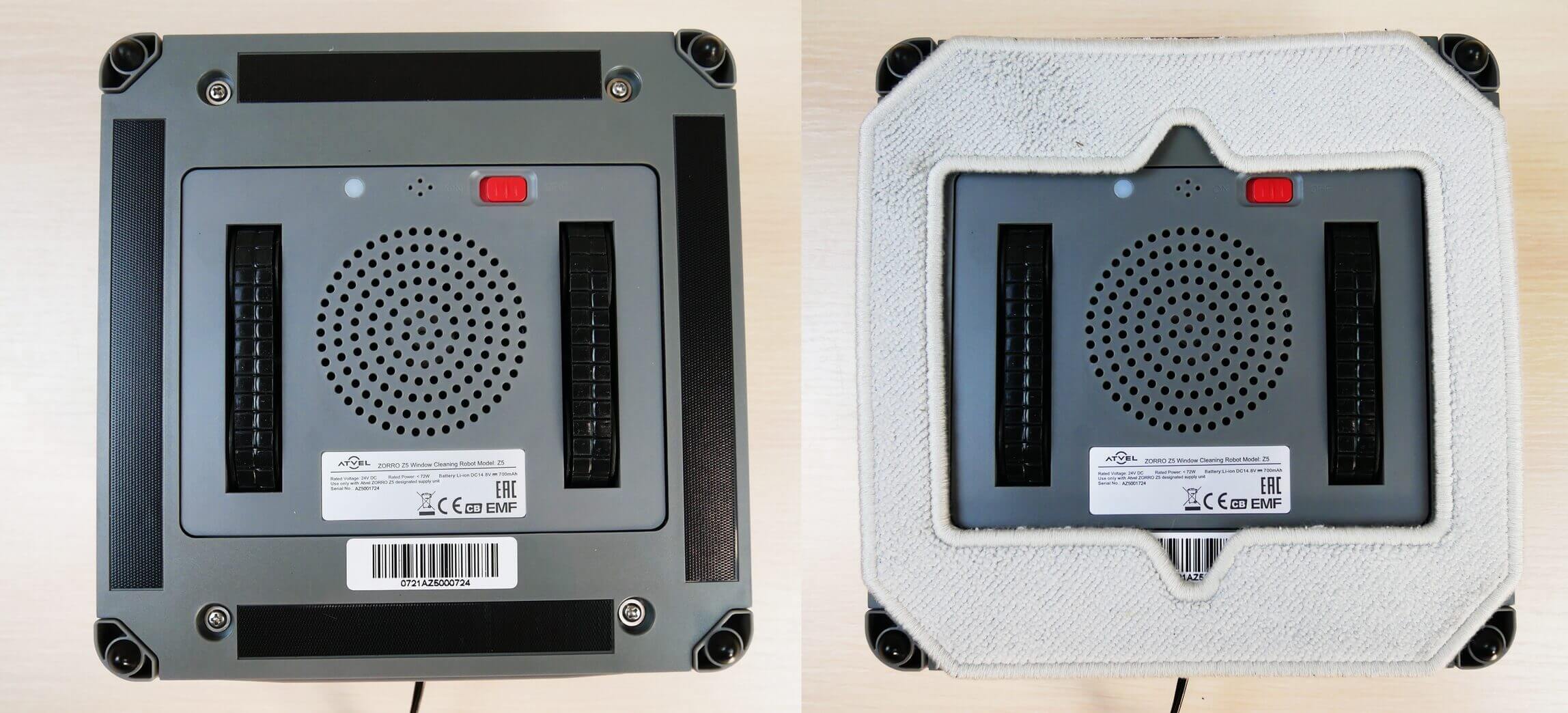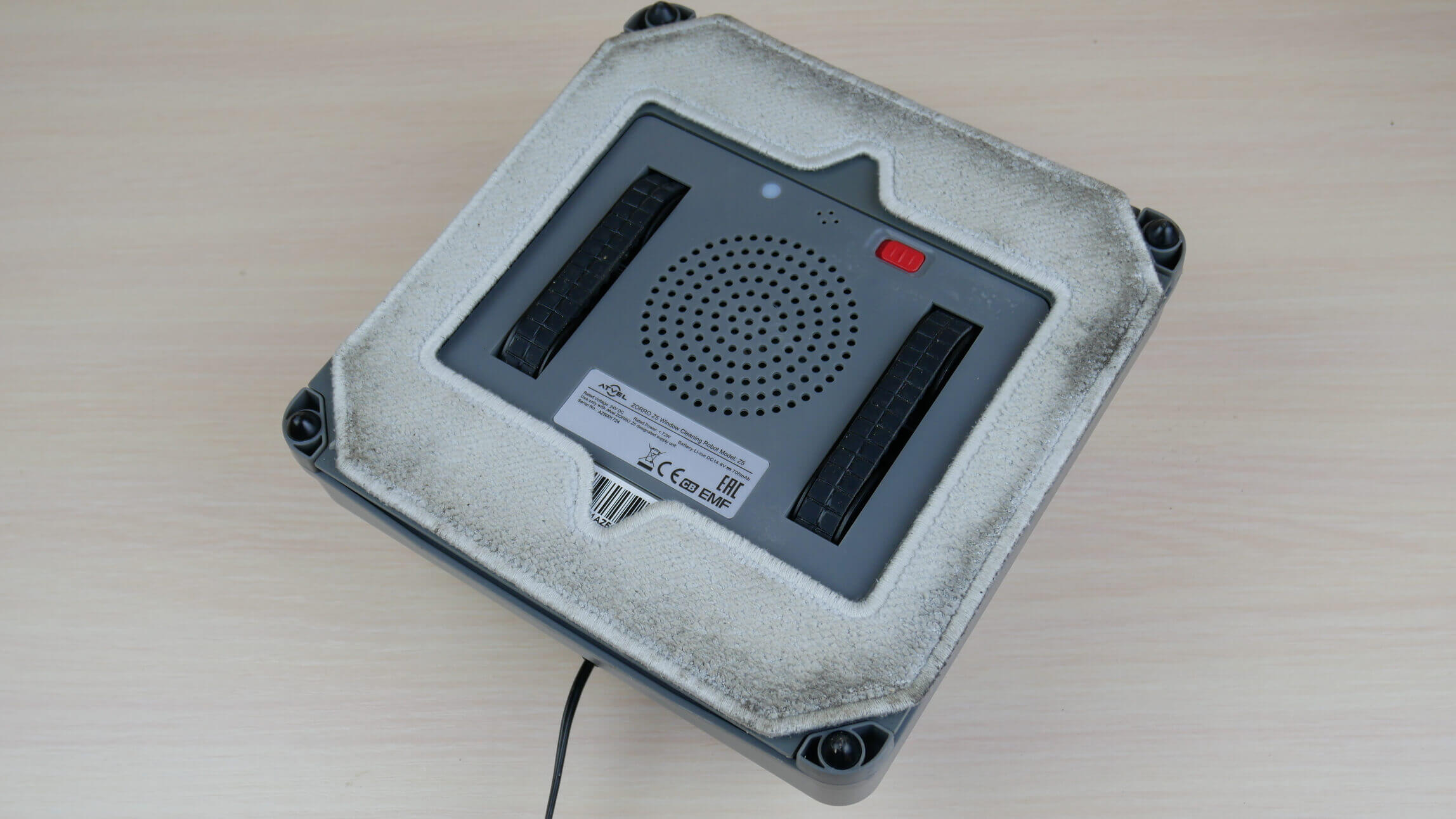 Pažvelkime į roboto apačią. Raudonas maitinimo mygtukas iš karto patraukia akį. „Atvel Zorro Z5“ juda guminiais bėgiais. Audinys prie korpuso pritvirtintas „Velcro“ lipdukais. Mechaniniai jutikliai, apsaugantys robotą nuo kritimų, yra kampuose. Pagrindinio variklio ventiliacijos angos, kurios pritraukia robotą prie stiklo, yra centre.