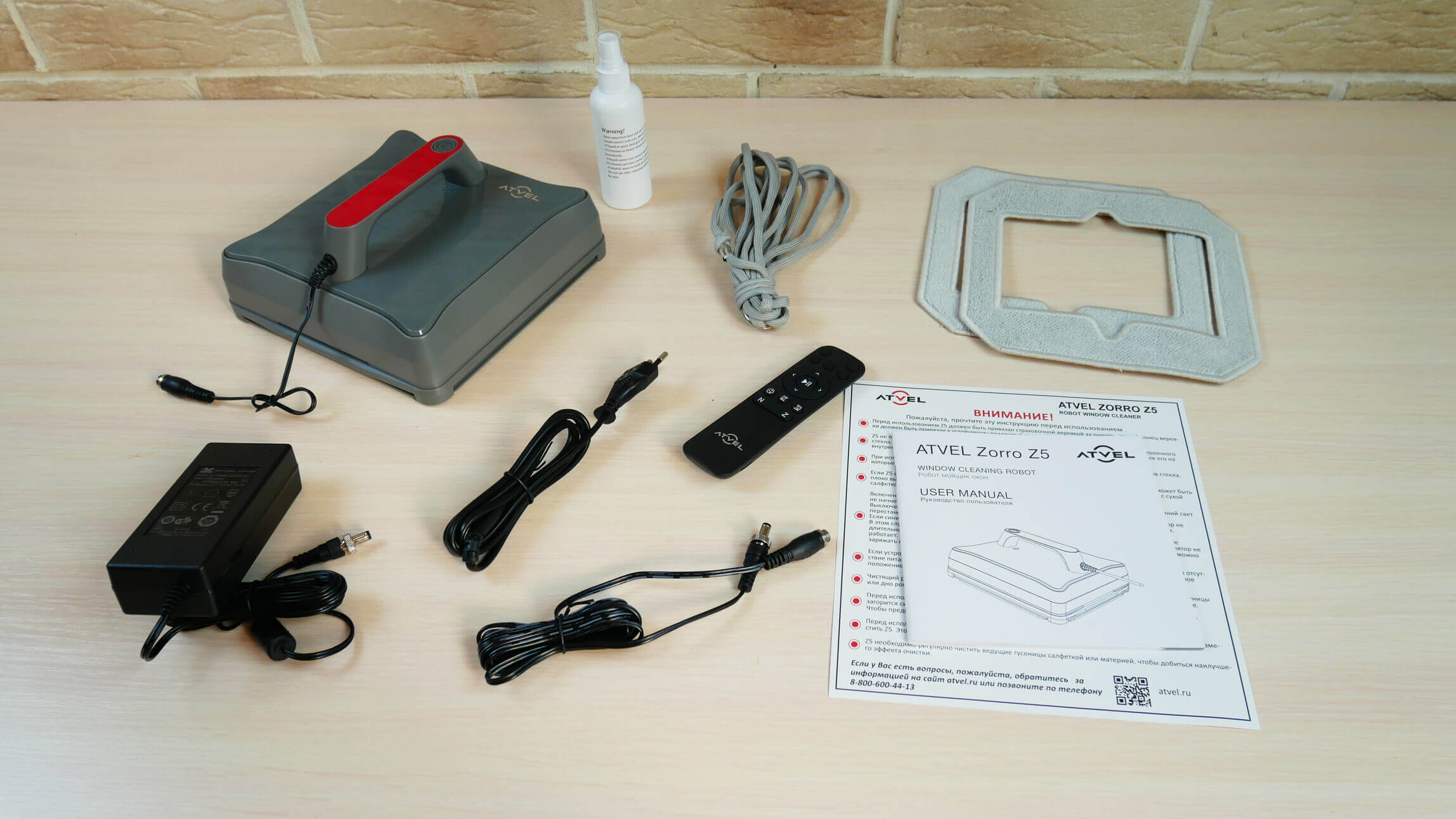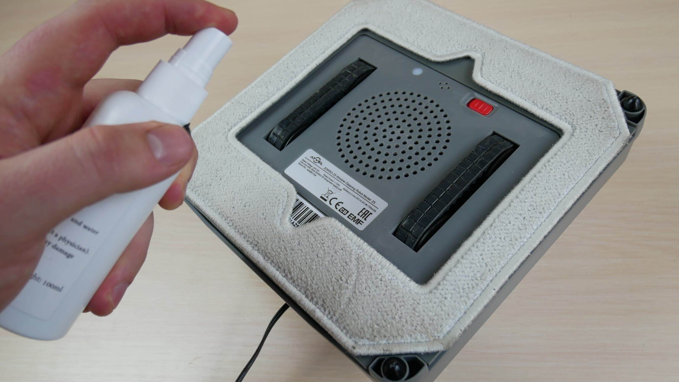Dabar patikrinkime, kaip gerai „Atvel Zorro Z5“ valo išorinį langą. Prieš pradėdamas, užpurškiau šiek tiek valymo skysčio ant šluostės, kaip rekomendavo gamintojas. Pritvirtinome apsauginį laidą, prijungėme maitinimo šaltinį ir pastatėme robotą ant lango.