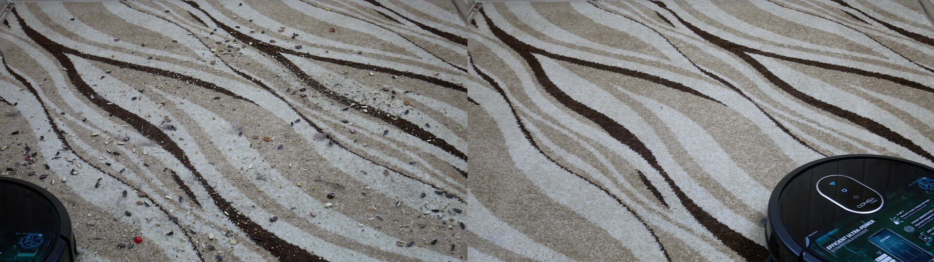 Kalbant apie siurbimo galią, su šerelių-žiedlapių šepečiu robotas surenka šiukšles tik iš 2 mm tarpo, o su guminiu šepečiu „Cecotec Conga 1790 Ultra“ sugebėjo surinkti šiukšles iš 4 mm tarpo. Tai yra pliusas, nepaisant standartinės nurodytos siurbimo galios.