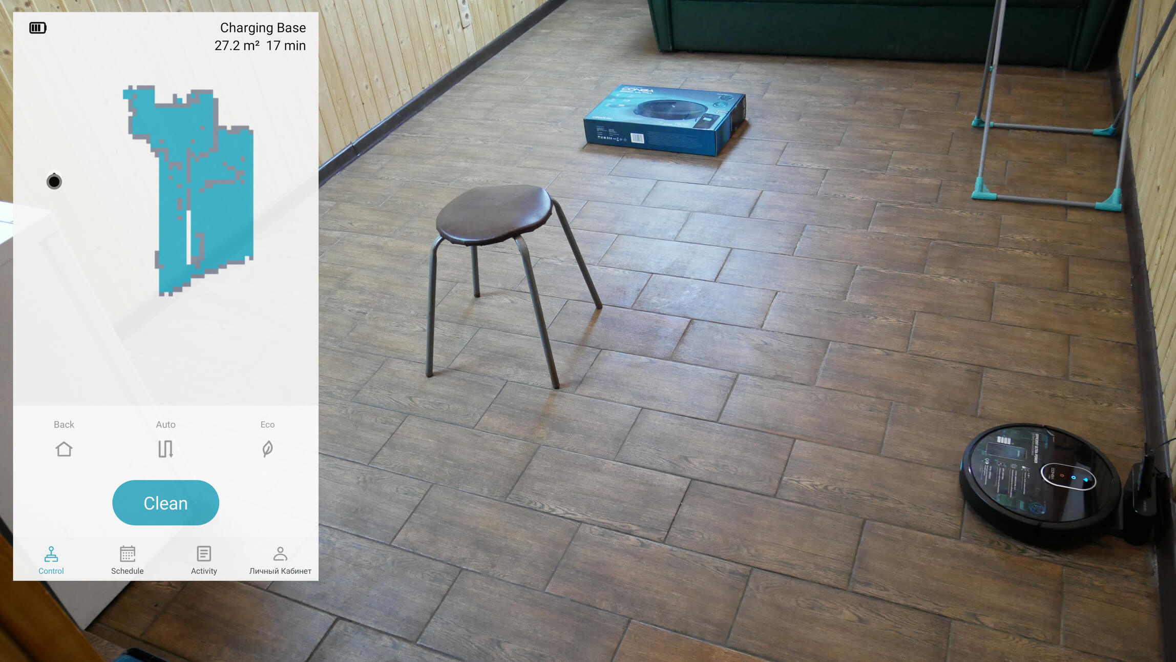 Pagrindiniame valdymo skydelyje robotas dulkių siurblys sukuria kambario žemėlapį realiuoju laiku. Tačiau atkreipkite dėmesį, kad šis žemėlapis nėra išsaugomas atmintyje. Po žemėlapiu yra keletas funkcijų. Pirmasis, kairysis, mygtukas naudojamas priversti robotą grįžti į įkrovimo bazę. Toliau galite pasirinkti vieną iš septynių valymo režimų: automatinį, atsitiktinį, perimetro, taškinį, vieno kambario valymą, grindinio valymo režimą arba rankinį valdymą. Taip pat galite reguliuoti siurbimo galią ir valymo šluostės drėgnumą.