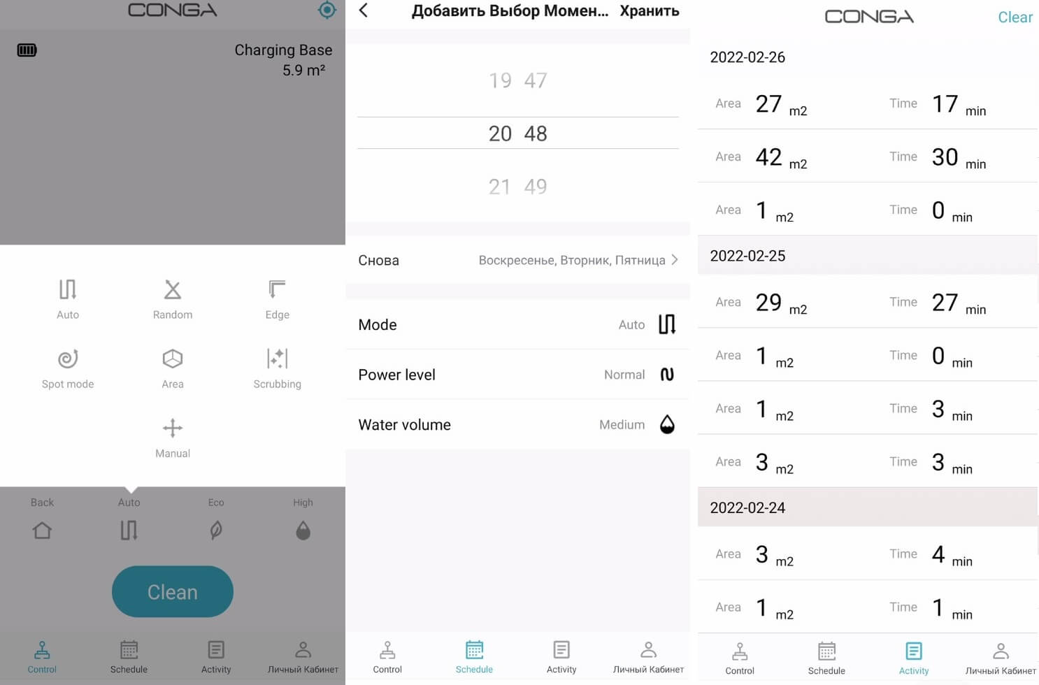 Pereikime prie „Conga 1790 Ultra“ funkcijų apžvalgos. Robotą dulkių siurblį galima valdyti tiek naudojant patentuotą mobiliąją programėlę, tiek nuotolinio valdymo pultą. Pirmiausia pažvelkime į programėlės funkcionalumą. Roboto prijungimas prie „Wi-Fi“ tinklo yra gana paprastas; vadovaukitės gamintojo instrukcijomis. Deja, programėlės sąsaja šiuo metu yra tik anglų kalba. Tačiau prekės ženklas žada artimiausiu metu išleisti programėlės versiją rusų kalba.