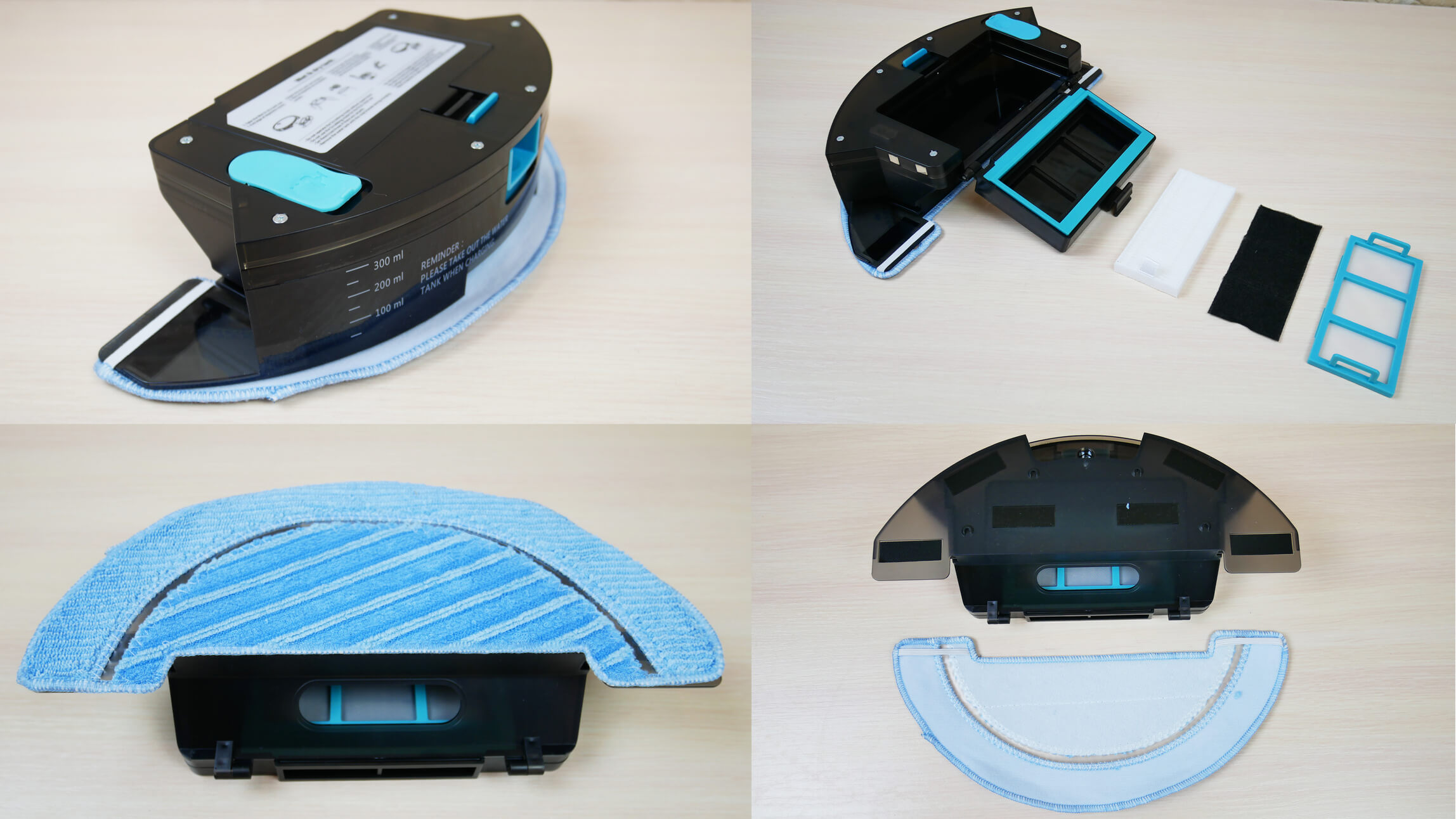 Vietoj atskiro atliekų konteinerio galite įrengti kombinuotą konteinerį su vandens baku. Bake telpa iki 300 ml vandens. Šluostė susideda iš dviejų atskirų dalių: viena tiekiama su vandeniu, kita surenka likusį skystį nuo grindų. Šluostė prie pagrindo pritvirtinta „Velcro“ lipdukais ir elastinėmis juostelėmis. Vanduo į šluostę tiekiamas per keturis vožtuvus. Elektroninis vandens srauto valdymas yra privalumas! Atliekų skyriaus talpa yra 200 ml. Triguba filtravimo sistema, sudaryta iš tinklelio, putplasčio ir HEPA filtrų.