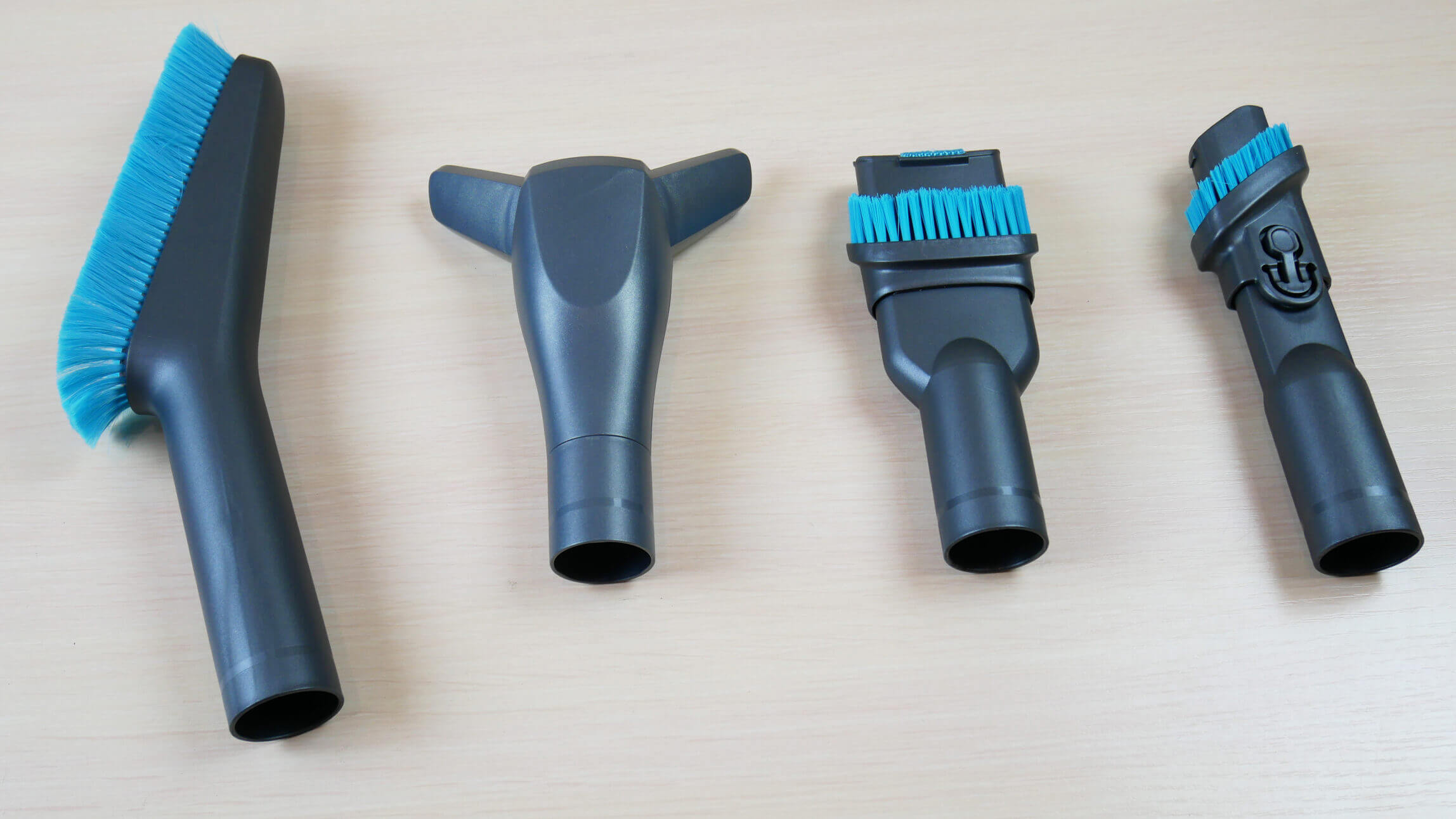 Pereikime prie priedų apžvalgos. Pagrindinis grindų antgalis turi pasukamą jungtį, kuri pagerina dulkių siurblio ergonomiką. Šepetys užsifiksuoja šone. Fiksatoriui nuimti nereikia jokių įrankių. Pūkų surinkimo volelis geriau tinka kietoms grindims valyti. Įdomu tai, kad pats antgalis turi šukas, skirtas susivėlusiems plaukams nuo šepečio pašalinti. Vietoj pūkų surinkimo volelio galima įmontuoti šerelių šepetį. Tai geriau tinka kilimams valyti.