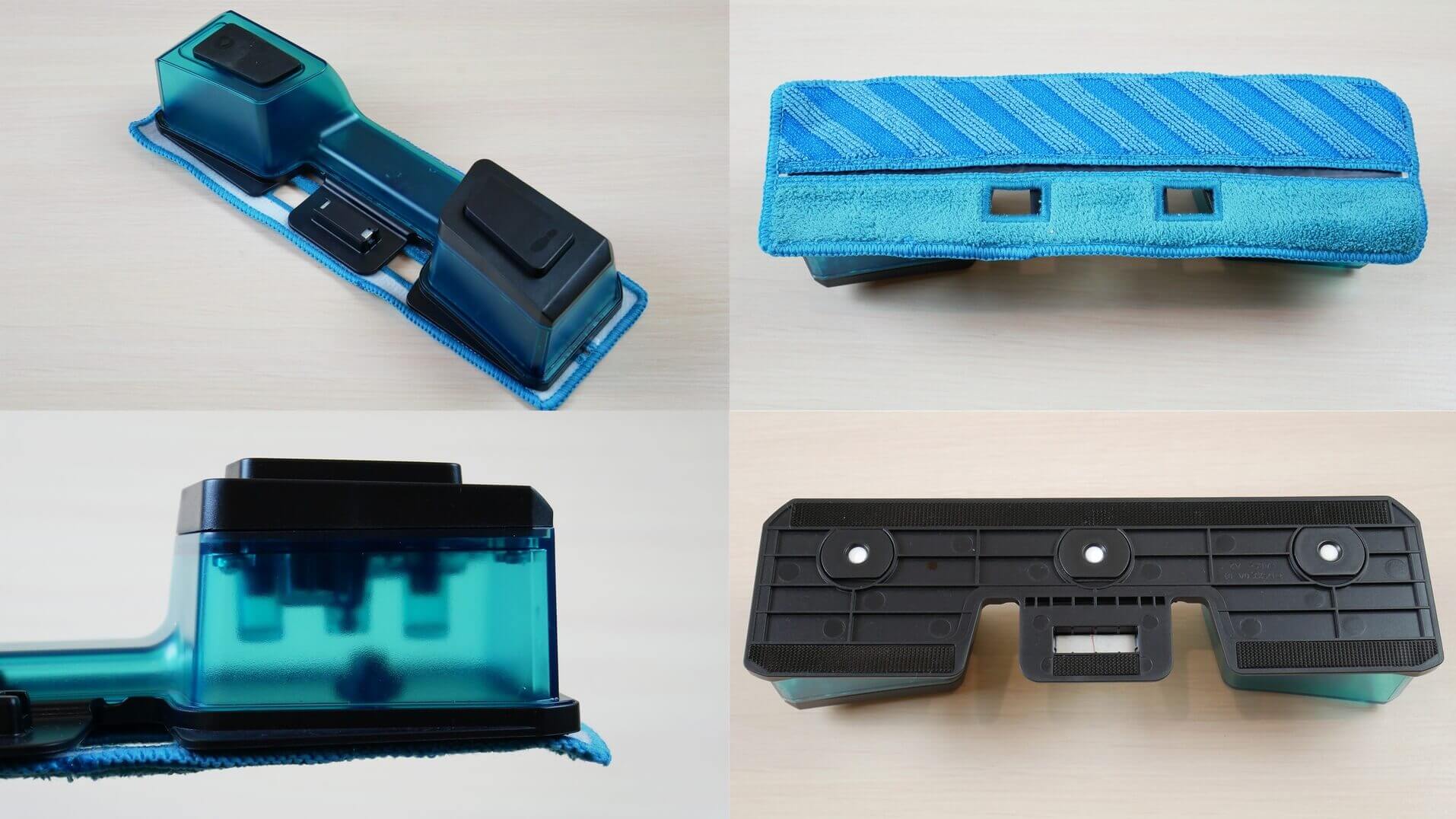 Bakelis talpina iki 300 ml vandens. Viduje esantis siurblys tiekia vandenį į šluostę. Norėdami tai padaryti, paspauskite specialų mygtuką viršuje. Mikropluošto šluostė yra padalinta į dvi dalis. Yra skylės voleliams, kad dulkių siurblys sklandžiai slystų paviršiais. Šluostė tvirtinama „Velcro“ lipdukais. Vanduo teka per tris angas su vožtuvais. Bakelis prie pagrindinio antgalio tvirtinamas magnetu. Tai gana patogu.