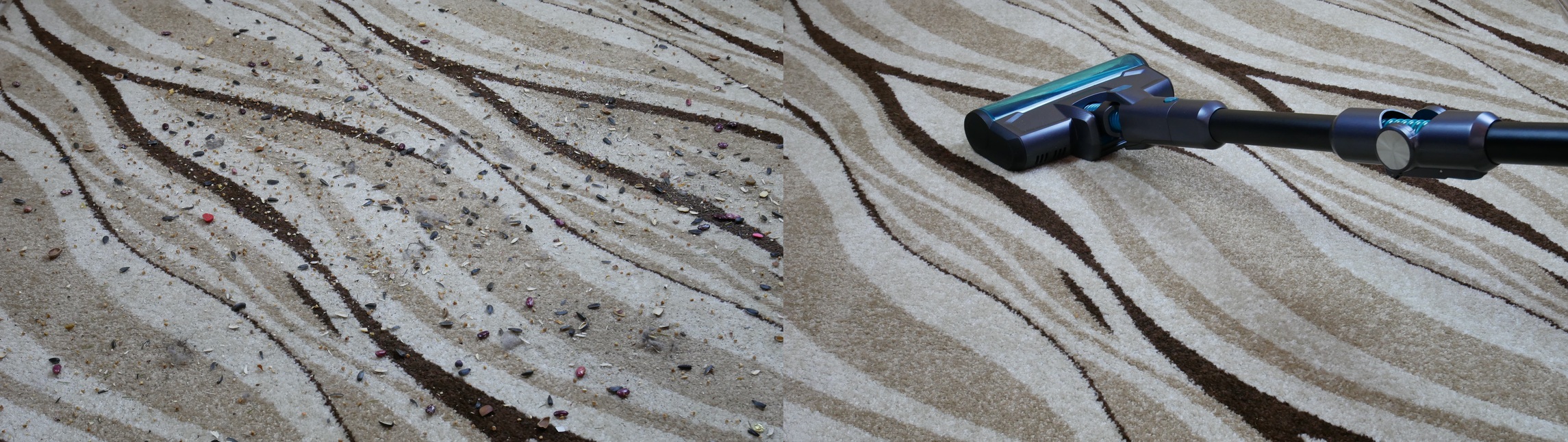 Tos pačios šiukšlės buvo išbarstytos ant kilimo. „Cecotec Conga RockStar 1500“ kilimų šepečiu jis kruopščiai išvalo kilimą net ir vidutiniu galingumu. Maksimaliu galingumu dulkių siurblys labai giliai išvalo kilimą. Ir vėlgi, šepetys po valymo yra švarus, o visos šiukšlės sandariai suspaudžiamos į dulkių konteinerį.