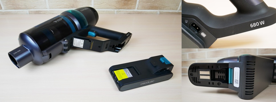 Baterija yra išimama. Šalia jos yra gnybtai dulkių siurbliui įkrauti ant sieninio laikiklio. Taip pat yra jungtis, skirta tiesiogiai prijungti įkroviklį.