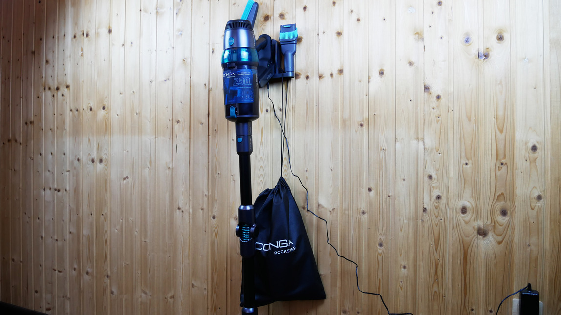 Taip pat norėčiau pabrėžti sieninį laikiklį. Jis puikiai tinka dulkių siurbliui įkrauti, priedams laikyti ir netgi krepšiui su kitais priedais pakabinti, jei reikia. Koks patogus sprendimas!