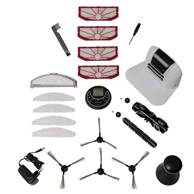 Be paties roboto dulkių siurblio, pristatymo rinkinyje yra šie komponentai: