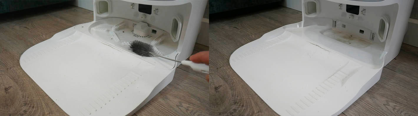 Štai kaip veikia stotelės valymo funkcija. Įpumpavau vandenį, šepečiu išvaliau padėklą, o tada vanduo nusausintas. Dalis nešvarumų buvo nuplauti, bet dalis liko, kartu su didesnėmis šiukšlėmis, įskaitant plaukus. Be to, po nuimamu padėklu, išleidimo angoje, kaupiasi šiek tiek nešvaraus vandens.