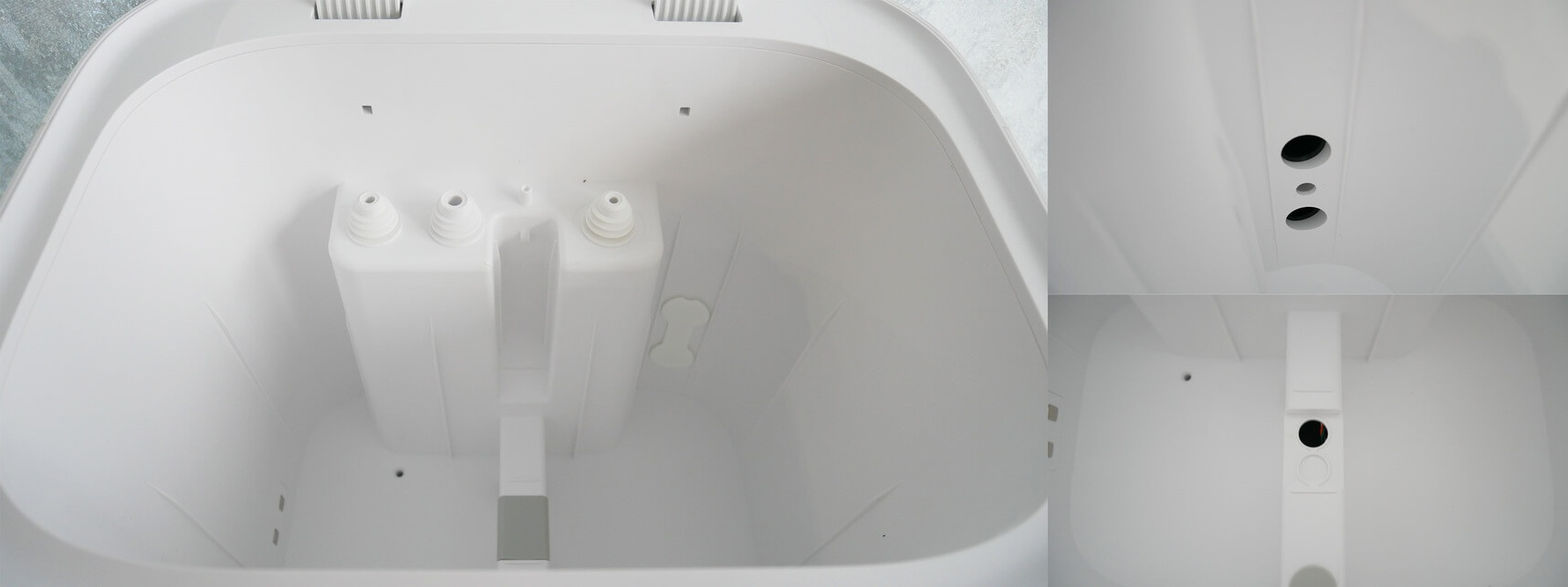 Išpakuodamas nustebau neradęs pridėtos kasetės. Maniau, kad jie taupė šiai eksploatacinei medžiagai. Tačiau paaiškėjo, kad viskas daug blogiau – kasetės lizdas išliko toks pat kaip ir „L10s Ultra“, bet nuėmus dangtelį apačioje, nėra antgalio kasetei pritvirtinti. Pasitikrinau su prekės ženklo atstovais – šis modelis nepalaiko automatinio ploviklio dozavimo į servetėlių skalavimo zoną. Tai dar vienas REIKŠMINGAS skirtumas, palyginti su supaprastintu modeliu. Ne pats geriausias sprendimas, atsižvelgiant į tai, kad stotelės dizainas nepasikeitė. Tačiau viduje yra kištukai, skirti prijungti prie stotelės komunalinių paslaugų. Išorėje nėra jokių angų, be to, buvo nurodyta, kad stotelė neprijungiama prie kanalizacijos ar vandentiekio. Apskritai stotelės dizainas tikrai keistas.