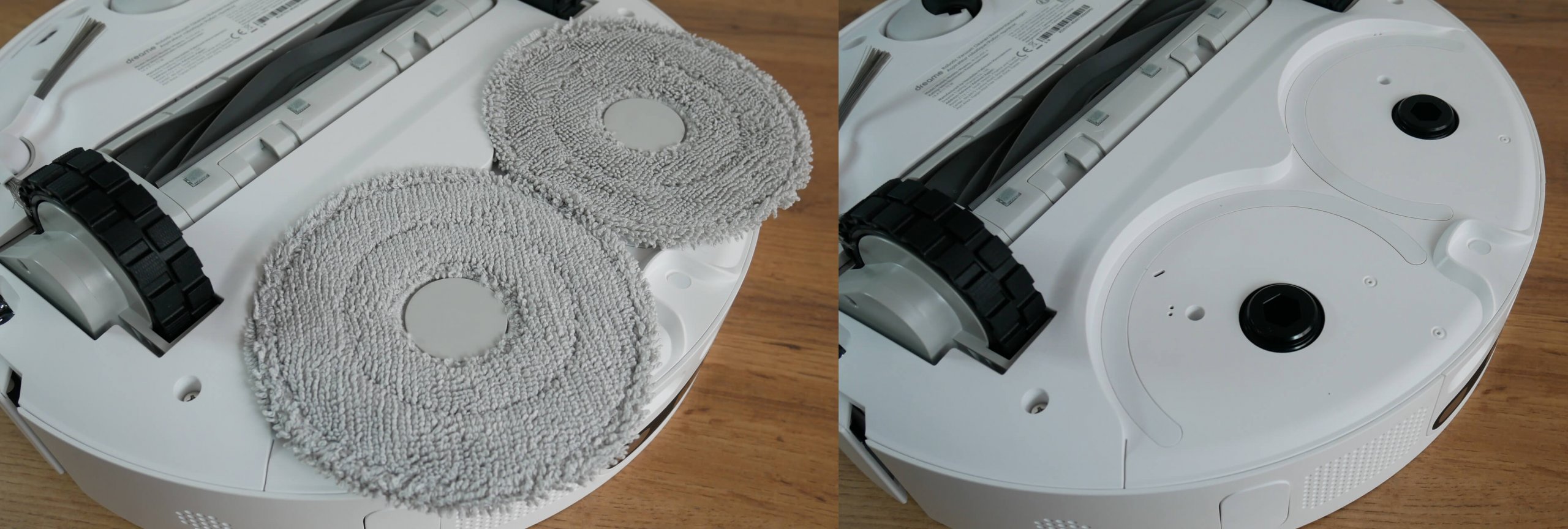 Už šepetėlių bloko yra dvi apvalios, besisukančios mikropluošto šluostės. Jos lengvai pritvirtinamos prie roboto dulkių siurblio korpuso magnetais ir laikomos „Velcro“ lipdukais. Kaip ir ankstesniame modelyje, jos nesikiša už korpuso kraštų, todėl grindų valymas arti baldų ir grindjuosčių, kaip ir panašių modelių atveju, išlieka iššūkiu. Įdiegta sistema, skirta šioms šluostėms pakelti įlipant ir išlipant iš kilimų. Prireikus jas tiesiog atsukite arba suvyniokite atgal. Šluostes galima pakelti iki 7 mm.