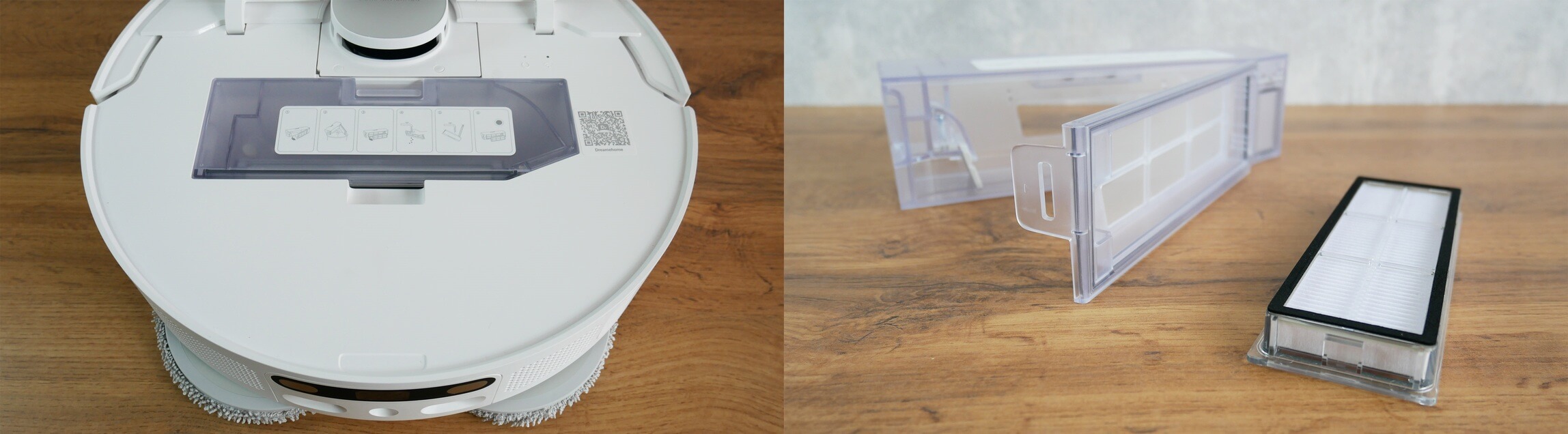 Dulkių talpykla yra po viršutiniu dangčiu. Kaip ir filtravimo sistema, ją galima plauti vandeniu. Talpykloje yra tinklelio filtras ir HEPA filtras. Dulkių talpykloje telpa iki 350 ml sausų atliekų. Vandens bakas yra paslėptas roboto viduje ir nėra pasiekiamas. Vandens bako talpa yra 80 ml.