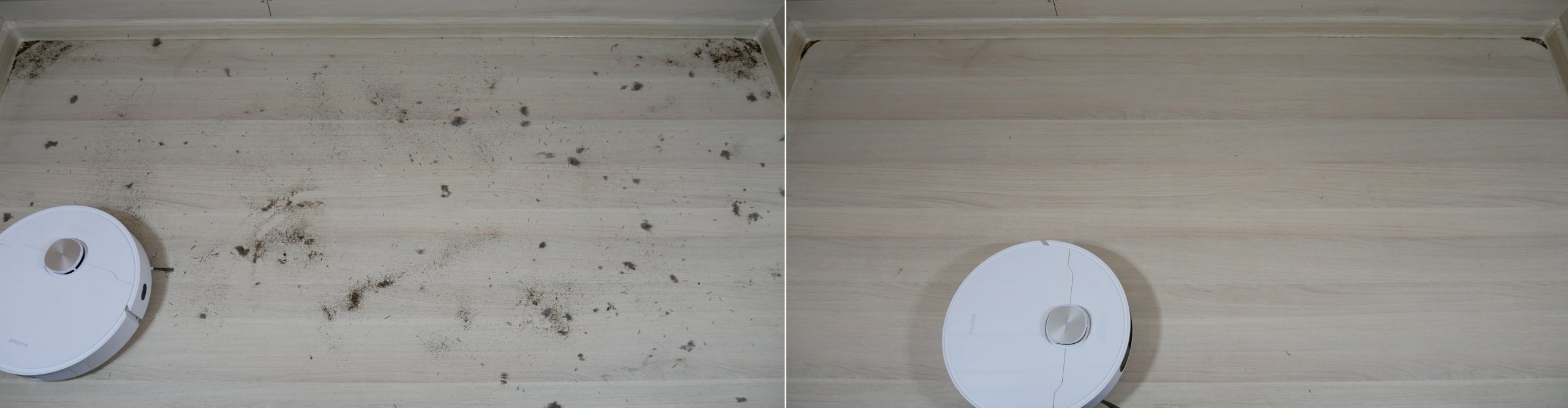 Nenorėjau roboto išpurvinti purvu ir padažu, nes vėliau būtų labai sunku išvalyti ratus ir kitus šių purvo komponentus. Kadangi valymo modulis yra identiškas „L10s Ultra“, panaudojau jo bandymų rezultatus. Šis robotas dulkių siurblys susidoroja su purvo šalinimu, atsižvelgdamas į kelis tarpinius važiavimus į valymo stotį servetėlėms nuplauti. Tai yra pagrindinis tokių robotų privalumas. Viso valymo ciklo metu purvas nebus įtrintas į grindis. Todėl per kelis važiavimus robotas gali iš tikrųjų išvalyti grindis, o ne tik jas nušluostyti. Siaura grindų dalis palei grindjuostę liko nenuplauta, nes servetėlės nepasiekia kraštų. Tai visų išbandytų robotų dulkių siurblių problema.