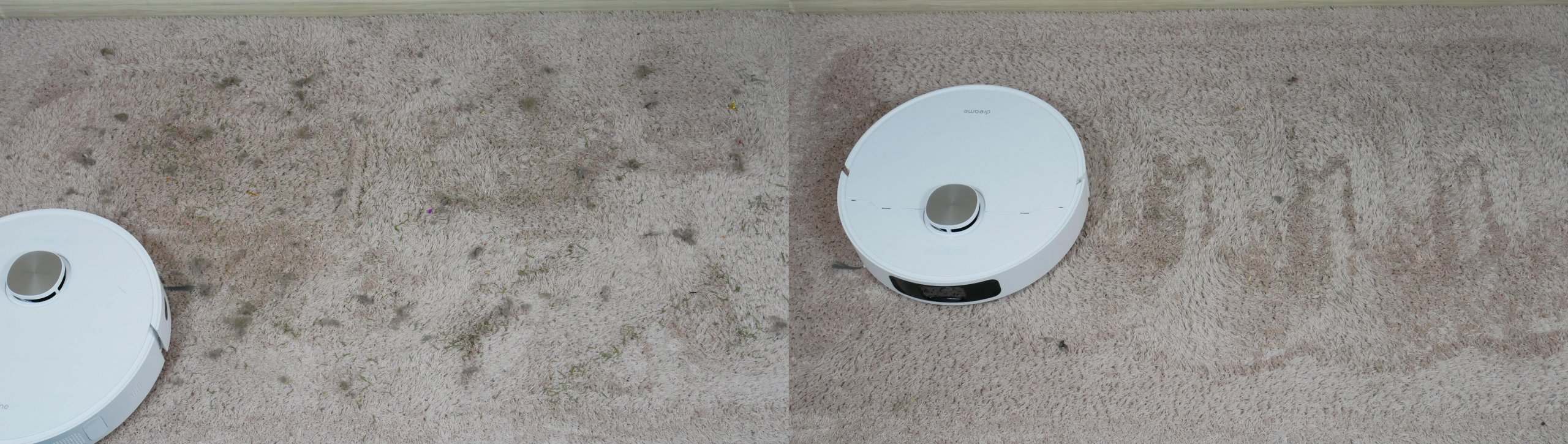 „Dreame Bot L10 Ultra“ taip pat gerai išvalė kilimus. Tačiau silikoninis šepetys yra mažiau efektyvus vidutinio plauko kilimams nei standartinis šerelių ir žiedlapių šepetys. Matome, kad liko keletas plaukų ir kailio kuokštelių. Tačiau, palyginti su kilimo būkle prieš ir po valymo, manau, kad robotas dulkių siurblys atliko gerą darbą! Ir trumpas patarimas: prireikus galite įdiegti „Mijia OMNI B101CN“ šerelių ir žiedlapių šepetį, kad kilimų valymas būtų geresnis.