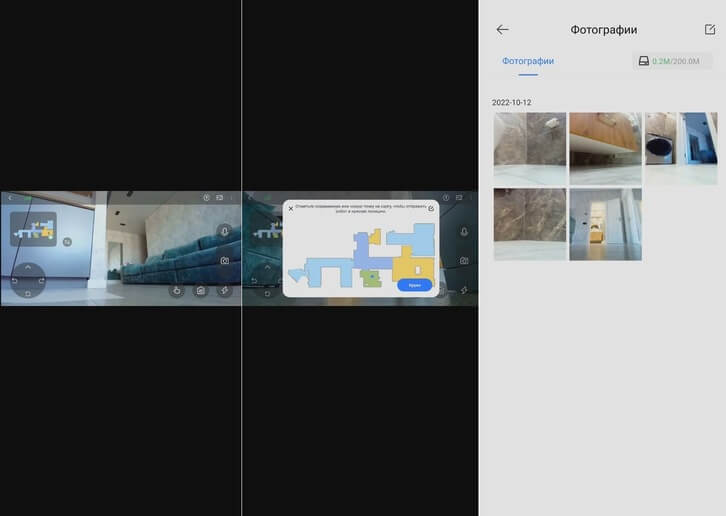 Kaip matote, yra daugybė valymo parametrų pritaikymo galimybių. Pademonstruosiu nuotolinio namų stebėjimo funkciją per išmanųjį telefoną. Įvedus pasirinktą slaptažodį, įjungiama kamera, kuri perduoda vaizdus realiuoju laiku į jūsų išmaniojo telefono ekraną. Vaizdo kokybė yra aukšta. Robotą galite valdyti rankiniu būdu arba nurodyti vietą žemėlapyje, kur jis turėtų automatiškai judėti. Taip pat galite fotografuoti, kurios bus išsaugotos atskirame aplanke, ir siųsti balso pranešimus per roboto garsiakalbį. Kita naudinga funkcija – nukreipti robotą į konkrečią vietą, kur jis suksis vienoje vietoje ir automatiškai fotografuos kambarį iš visų pusių. Tai vadinama apsaugos režimu. Labai patogu.