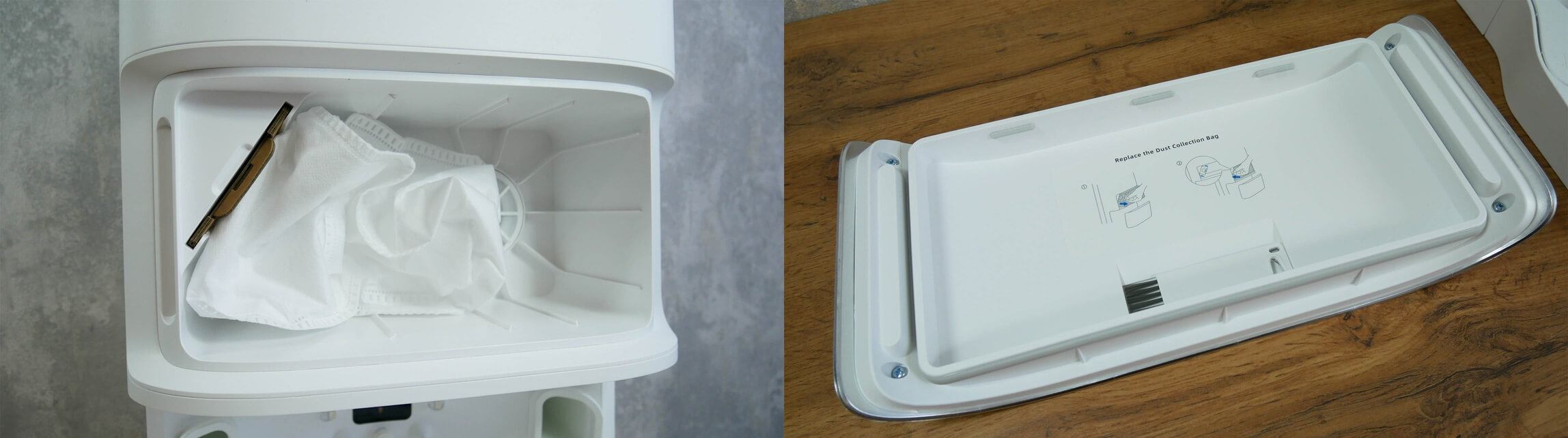 Virš platformos yra skyrius su atliekų maišu. Jis paslėptas po magnetiniu dangteliu. Labai patogu. Pačiame dangtelyje taip pat yra roboto valymo įrankis – dar viena labai patogi savybė. Pačiame maiše telpa 3 litrai sausų atliekų.